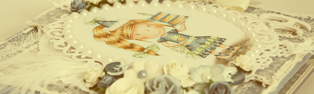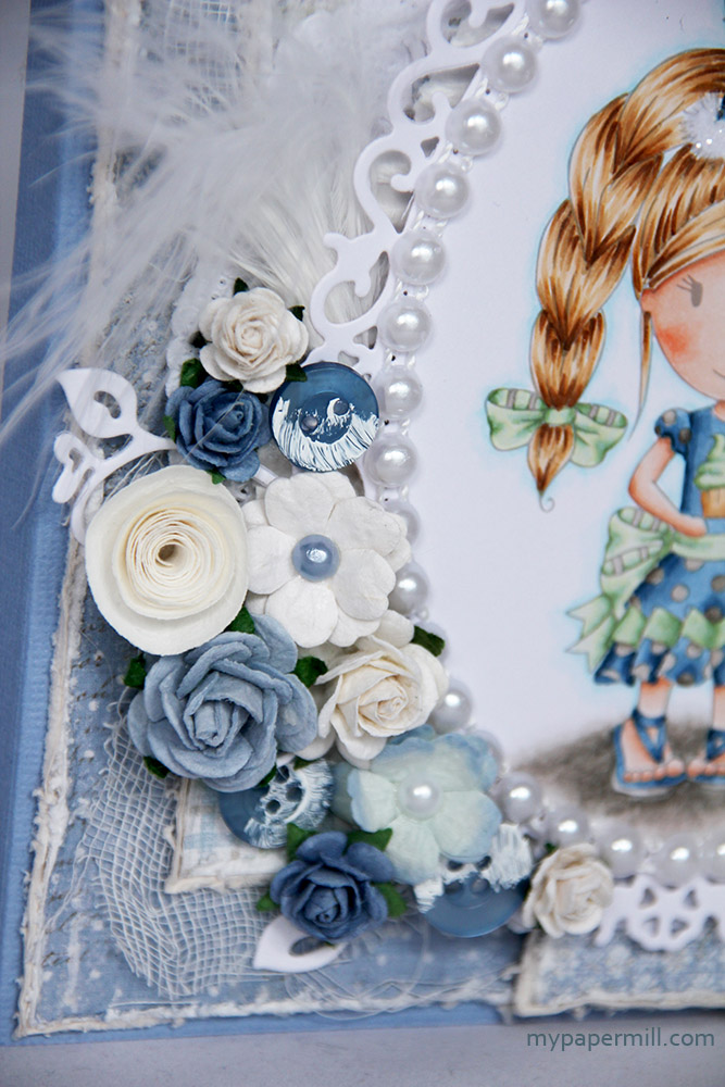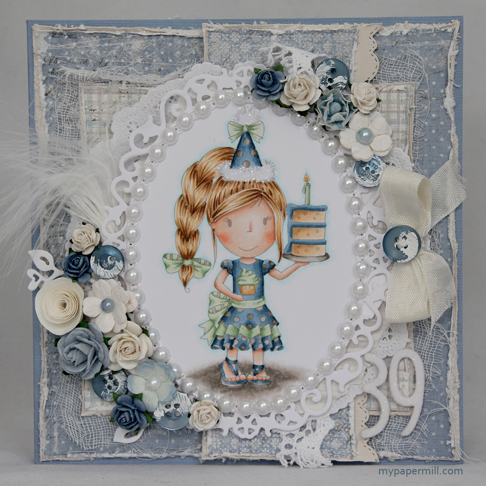 Jill forsideMitt kort ble et bursdagskort til Jill denne gangen, hun hadde bursdag i slutten av august, og alle bursdagsbarn fortjener bursdagskort! Jeg brukte jenteversjonen av motivet, men det finnes en gutteversjon også. På dette kortet er det ikke noe som heter less is more. Jeg har brukt en haug med blomster, noen knapper og noen fine mønsterark fra min favorittprodusent – Maja Design. Osteklut, kakeserviett, hvit bølgepapp, blonde og en tag har jeg også klart å snike inn, i tillegg til noen snirklete diecuts som knapt vises, laget med en Magnolia-die. Tallene har jeg stanset ut i hvit kartong, jeg limte 5-6 lag oppå hverandre for å få litt tykkelse på dem, og la distress glitter på det øverste laget. Kanten og dusken på hatten på motivet har også fått glitter!