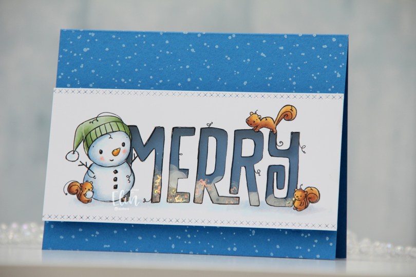 I die cut the cover die from Stamper’s Select White cardstock from Papertrey Ink, added acetate to the back and adhered my snowmen to the back of the acetate in a few of the windows. Onto a panel of Sno Cone cardstock from My Favorite Things, I did some very subtle ink blending at the bottom of each row of snowglobes, using Sno Cone ink, also from My Favorite Things. The ink blending adds a little gradient to each of the snowglobes. I stamped a sentiment from the Julehilsen stamp set from Norsk Stempelblad AS using Caribbean Sea ink from My Favorite Things.