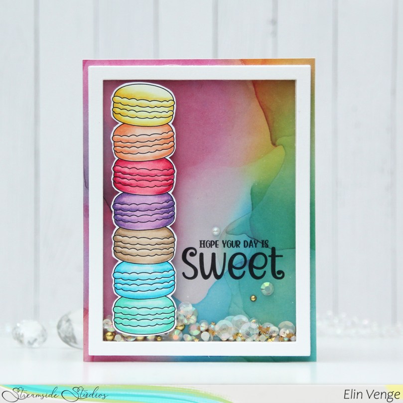I cut down a piece of patterned paper from the Ink Drops – Vivid paper pad from Craft Consortium. I chose this particular sheet because the colors I used for the macarons are well represented in the paper. I printed the sentiment directly onto the patterned paper and adhered it to a top fold card base I created from Stamper’s Select White cardstock from Papertrey Ink. I die cut the largest frame in the Classic Rectangle Frames die set from My Favorite Things 9 times from white cardstock. I stacked them and adhered them to the card front, before adding sequins and gems to the well. The sequin mix I used is the Vanilla Kiss mix from Little Things from Lucy’s Cards. I adhered a few around my sentiment to keep them from falling to the bottom, then sealed my shaker well with a piece of acetate from Simon Says Stamp. I added one final white die cut frame on top of the acetate for a clean look and also adhered the stack of macarons to finish the card.