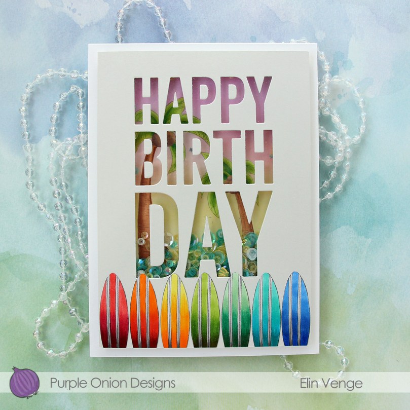 I added seven of my surfboards to the bottom of my panel and adhered it all to a top fold card base I created from Stamper’s Select White cardstock from Papertrey Ink.