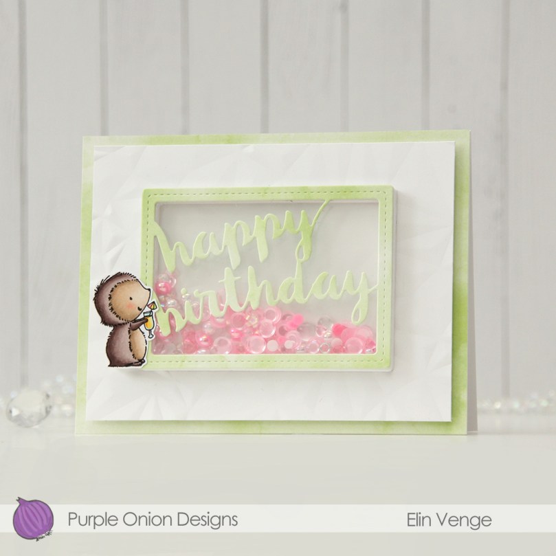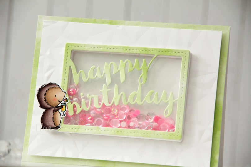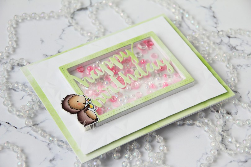 I then used the Stitched Happy Birthday Rectangle die from Memory Box to die cut once from the green patterned paper I’d already used and 10 or 11 times (I lost count) from white cardstock to create a shaker well. I cut the words out of the white frames, stacked them, added acetate to the back of my layered frame and adhered it in the center of the card. I then filled the shaker well with the Candy mix from Little Things from Lucy’s Cards. This mix has pearls, little flower shapes, sequins without holes, some hearts and raindrops. I topped it with another piece of acetate, then adhered the patterned paper die cut on top.