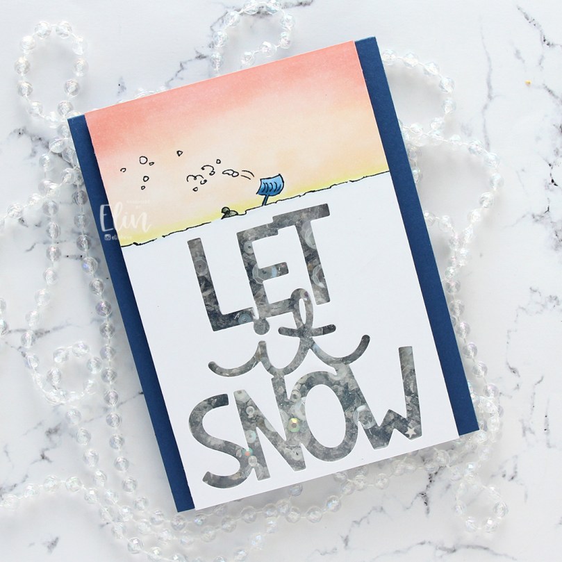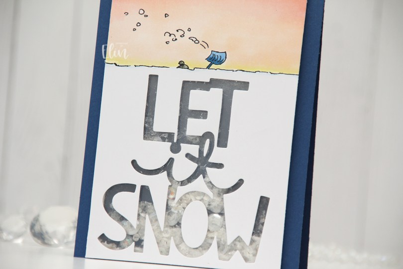 I used the Giant Let It Snow die from Lawn Fawn, covered my window with acetate and filled my shaker well with Distress Mica Flakes, a little bit of Rock Candy Distress Glitter and a small pile of embellishments from the Starry Night mix from Little Things from Lucy’s Cards.