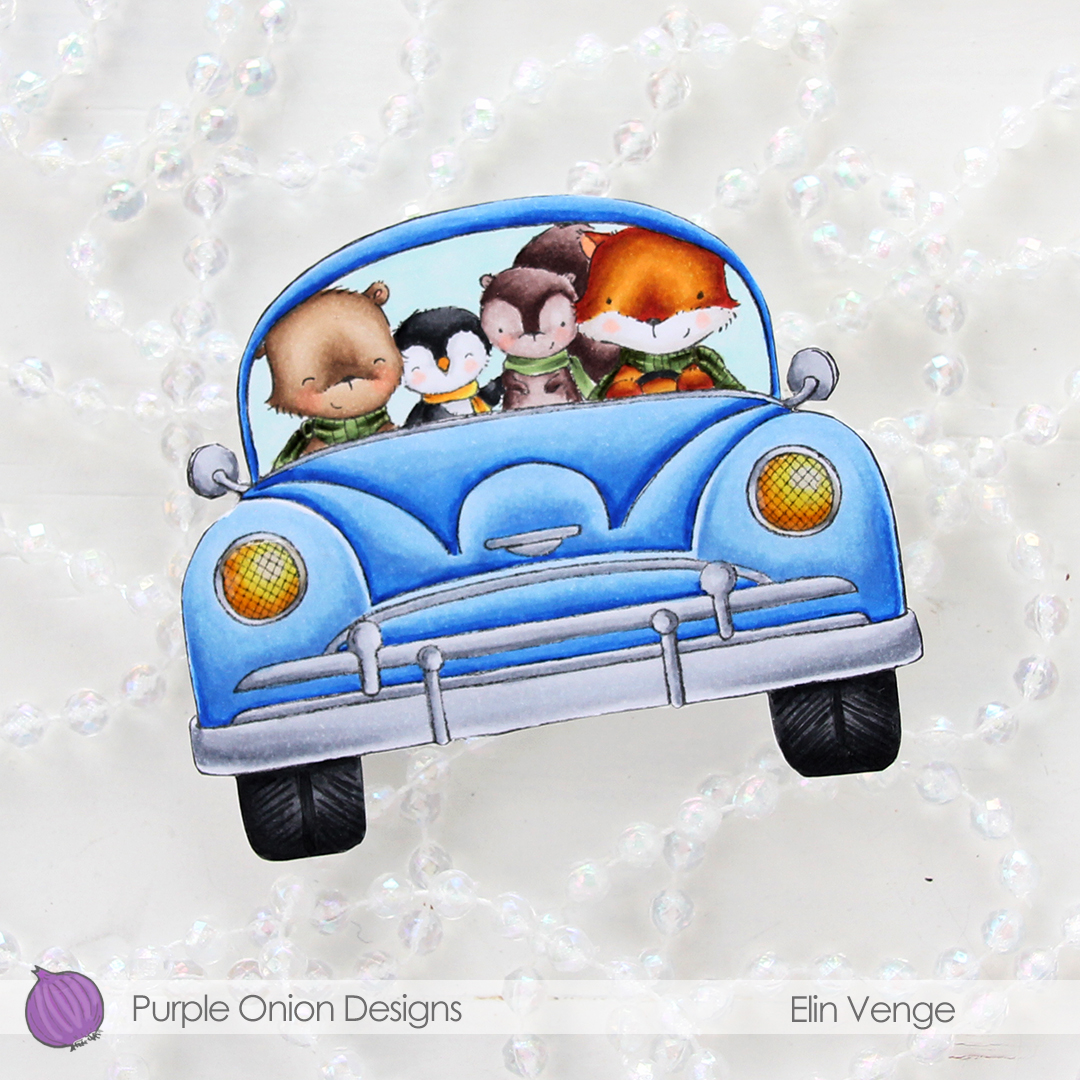 Hi, crafty friends! I’m sharing a small, super simple card today, featuring this On Our Way image from the I’ll Be Home For The Holidays collection illustrated by Stacey Yacula for Purple Onion Designs. This is a brand new collection that was released last week, and in it there are lots of images with a running theme: spending time with family & friends while enjoying the festivities and traditions of the holiday season with one another. This On Our Way image is perfect for that, and it reminds me of being a kid going to my grandparents’ for Christmas. It was a long drive, and the car was always packed full with presents.