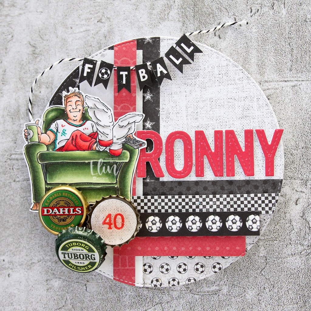 I colored the image to somewhat match the Liverpool team colors. Their uniforms are solid red, but I felt like I needed something besides just red, so I gave the guy a white T shirt with a couple of logos on it in proper team colors. I fussy cut the image and rummaged through my patterned paper looking for red and/or football themed papers. I found some football themed scraps and some neutral papers from Papirdesign, as well as some red scraps from P13. I used a stitched circle die set from My Favorite Things to create my card base and also to give the patterned paper scraps the rounded shape on the edge with that nice faux stitch border. I glued some pieces directly to the card base, adding layers of cardstock on the back of others for dimension and interest.
