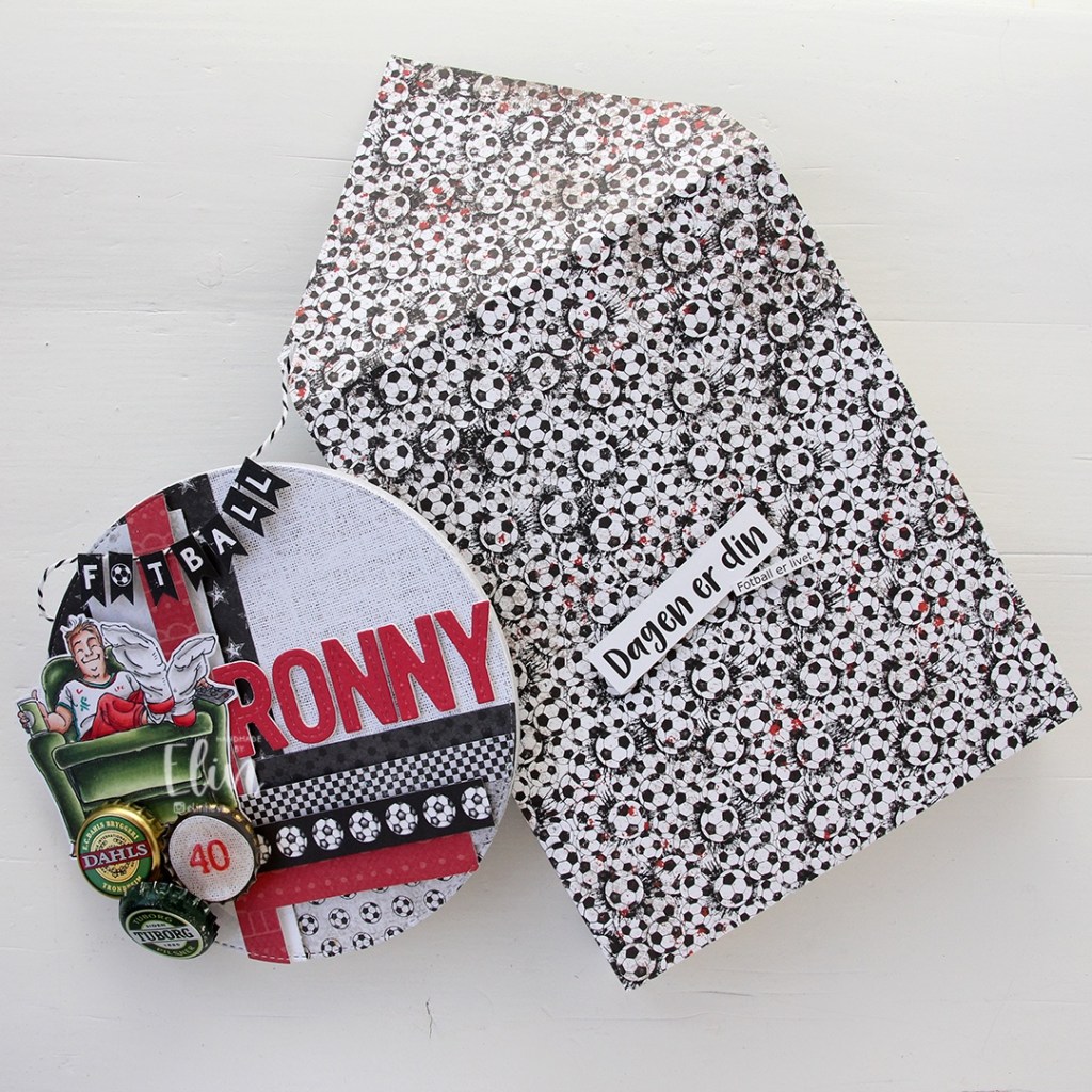 I didn’t have an envelope to fit this very dimensional 5 1/2” circle card, so I created one from patterned paper from Papirdesign. The paper is covered with footballs on one side with a few specks of red here and there (how perfect is that?), and football pitches on the back.