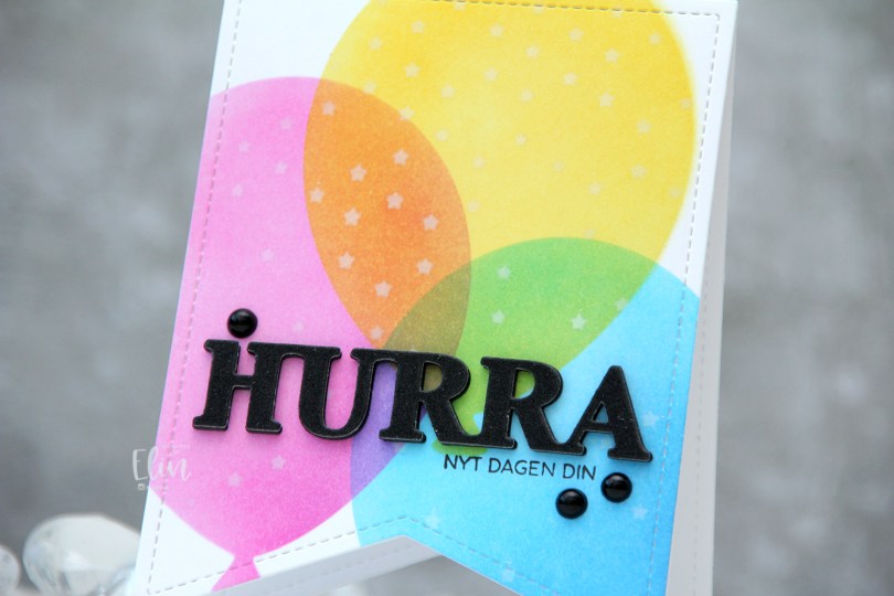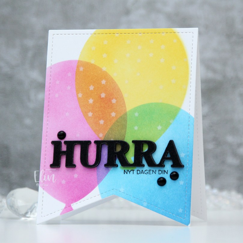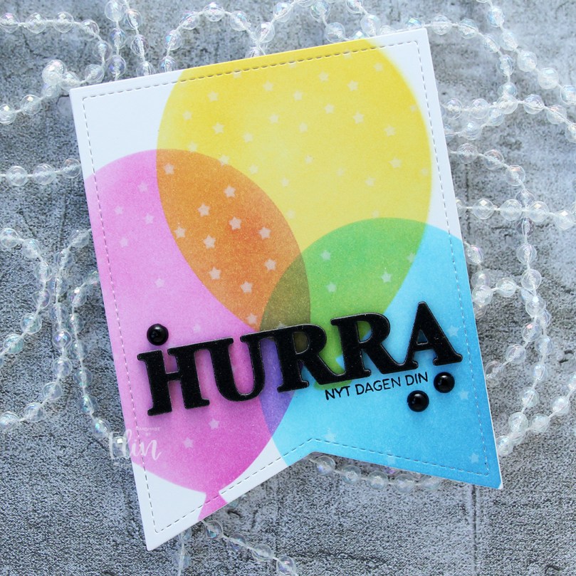I used the Big Balloon stencil set from My Favorite Things to create my balloons, and used Distress Inks for my ink blending. Faded Jeans, Mermaid Lagoon and Salty Ocean for the blue balloon, Picked Raspberry for the pink balloon and Mustard Seed and Squeezed Lemonade for the yellow balloon. Where they overlap, they create new colors, which is half the fun of ink blending, right? With the balloon stencil still in place, I added the Falling Stars stencil from Simon Says Stamp on top and ink blended white stars onto the balloons using Fresh Snow hybrid ink from Papertrey Ink.