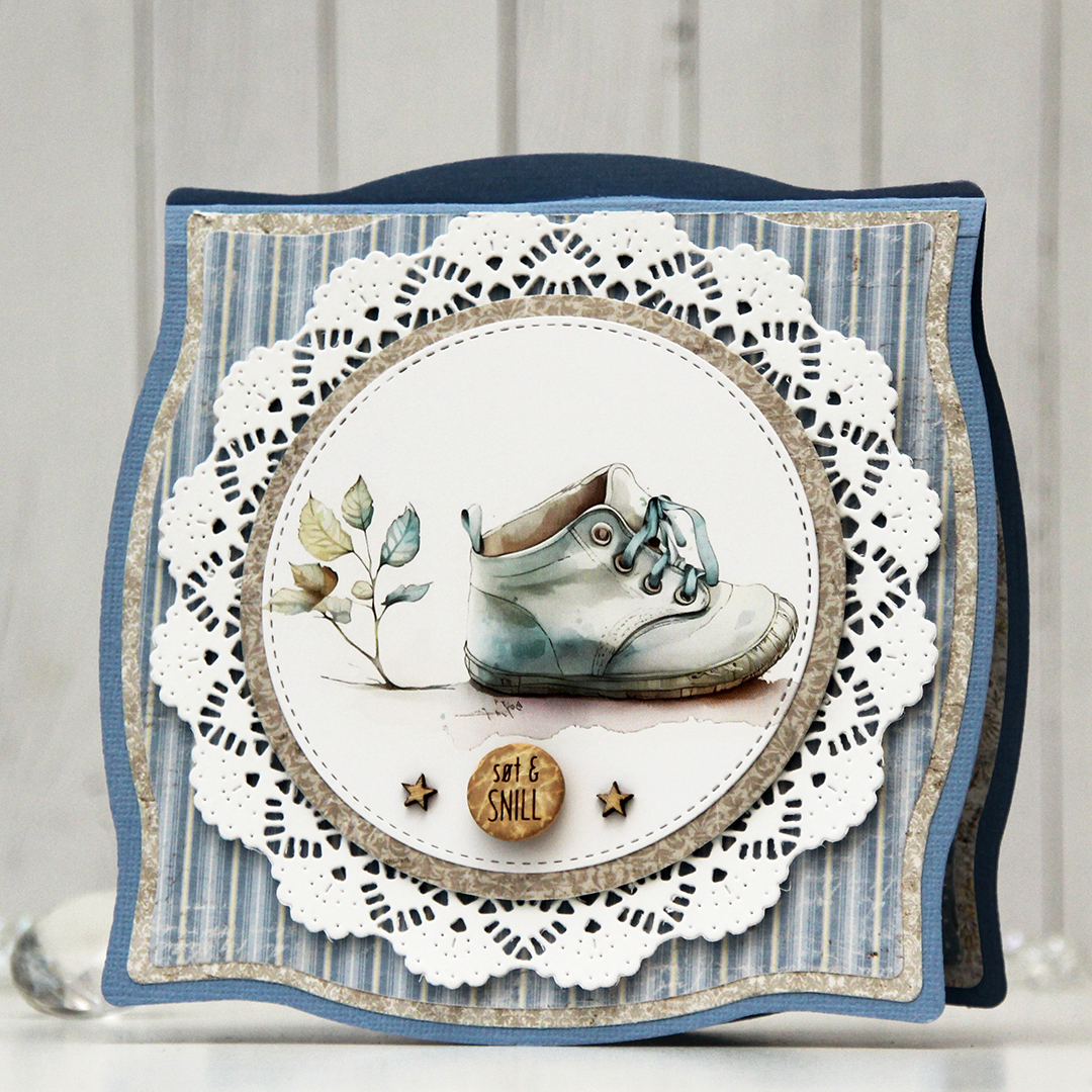 Cards like this come together very easily, it’s basically a bunch of diecutting and you’re done. I use two full 12×12 sheets of patterned paper for cards like this, and the beauty is that there are no scraps left when I’m done. For this one I used two sheets from Papirdesign, one is Roseduft, and the other is stemorsblomst, blå.