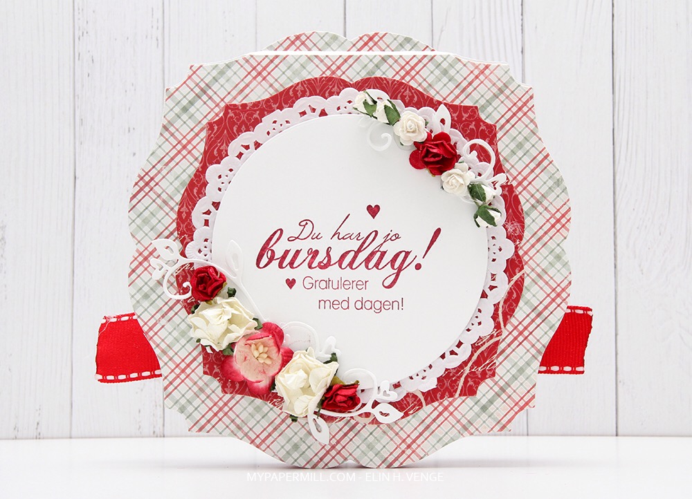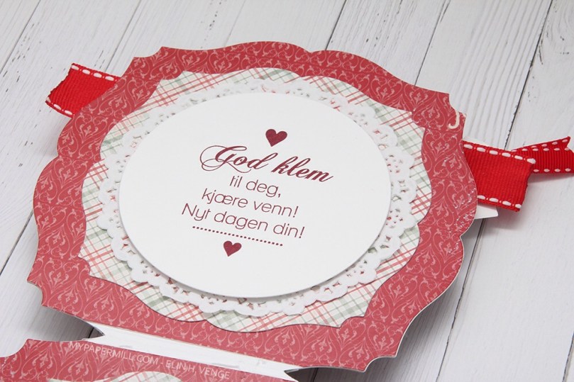 Jeg har laget et rundt kort denne gangen, med en bølgekant rundt det hele. Jeg stanset ut kortbasen min dobbelt, så mønsterarket med hjertene i bakgrunnen, og også det som jeg har brukt til rammen på fronten. Jeg brukte en sirkeldie til å stanse ut hull fra det lilla mønsterarket.