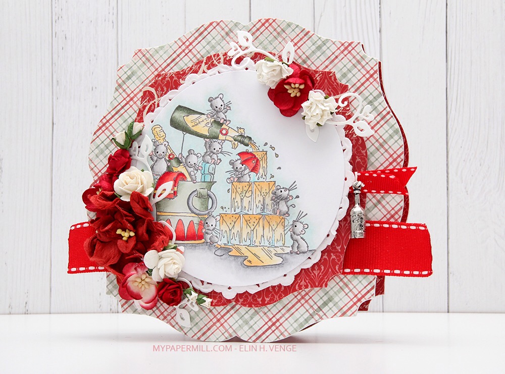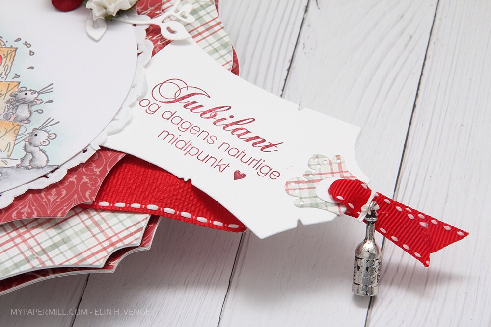 There’s a banner hidden behind that image, diecut with a Magnolia die. I tied a bow of seam binding ribbon with the help of a DIY bow easy, I can’t make nice bows for cards to save my life (true story!), so the Bow Easy helps. I stamped a Papirdesign stamp using Memento Sweet Plum ink, which also matches the patterned papers beautifully. On top of the bow I added an old button from Melissa Frances.