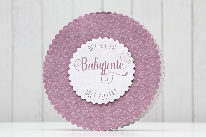 Innsidene har det samme oppsettet. Her har jeg brukt en die fra Papirdesign til å stanse ut en dekorativ slisse i den hvite kartongen for å lage plass til penger. Jeg har stemplet et bakgrunnsstempel fra NSD på den hvite sirkelen, og limt navnet på dåpsbarnet over med utstansede bokstaver av mønsterark. Den andre innsiden er lik, men der er den hvite kartongsirkelen beregnet til å skrive personlig hilsen på.