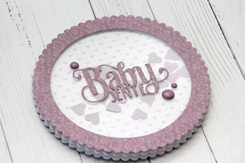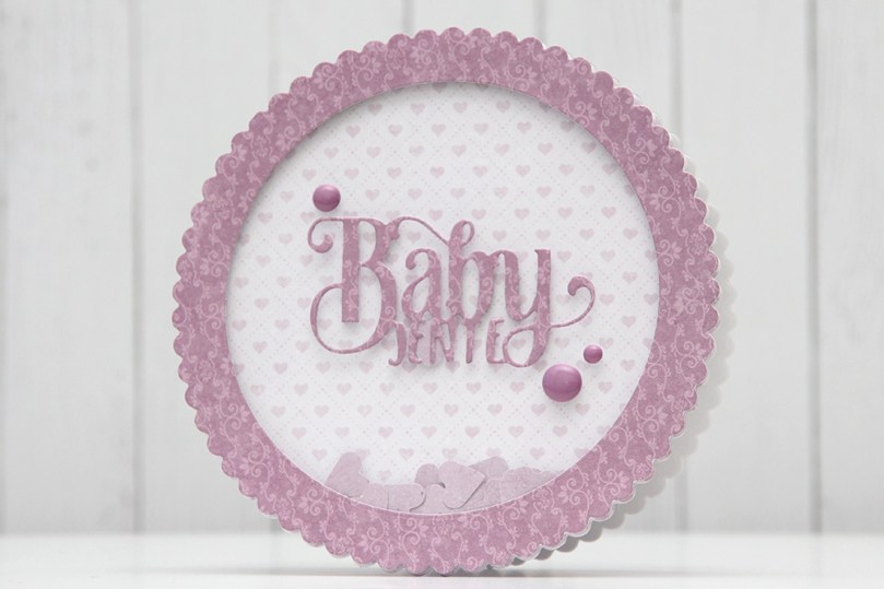 Jeg stanset ut ordet Babyjente i det samme mønsterarket som jeg brukte på rammen og fylte shakeren min med små, søte hjerter. Jeg pyntet veldig enkelt med noen lilla dotter.