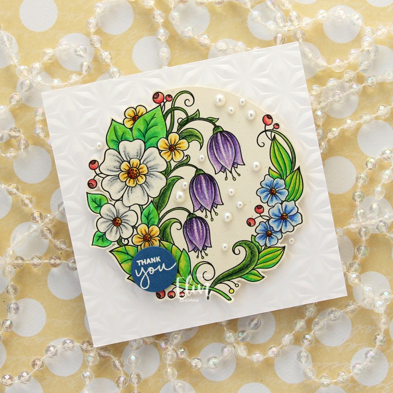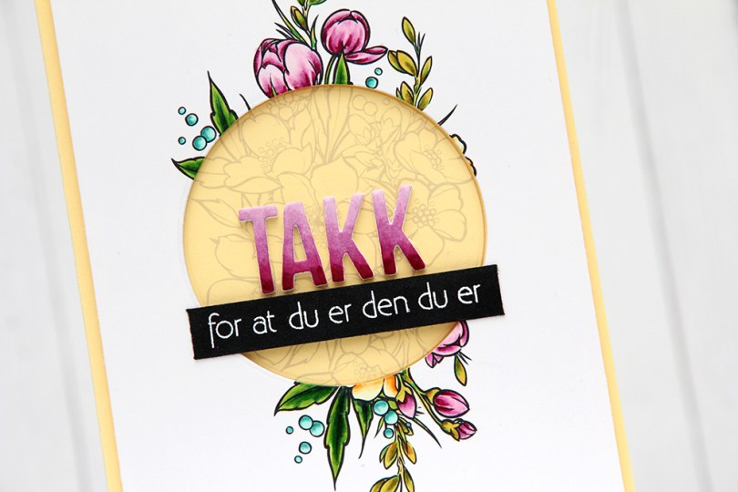 Jeg limte på det ferdig fargelagte panelet mitt på en gul kortbase med 3D-teip på hele baksiden, så det skulle få litt dimensjon. Den utstansede gule sirkelen ble limt rett på kortbasen og danner resten av motivet, selv om det ikke er fargelagt. Jeg stanset ut bokstavene til ordet takk med et Tim Holtz-alfabet fra Sizzix, fire ganger i hvit kartong og ett lag øverst i X-Press It, som jeg fargela med den samme rosakombinasjonen av Copics som jeg brukte på motivet. Jeg limte alle lagene til bokstavene oppå hverandre og limte dem fast midt i sirkelen.