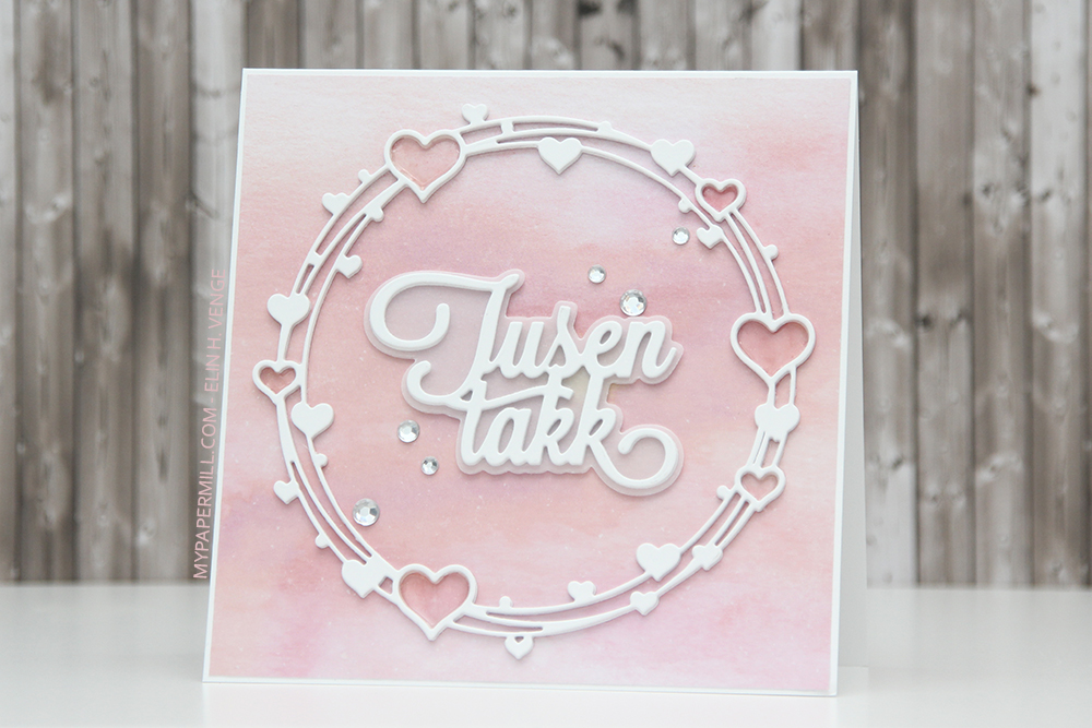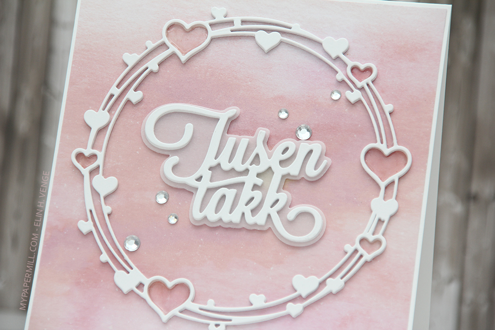 Jeg startet med å stanse ut hjertesirkelen i hvit kartong fire ganger, og limte alle lagene oppå hverandre. Jeg gjorde det samme med tusen takk, men limte kun tre oppå hverandre, så vellumen under, og to nye lag med tusen takk under der igjen. Da kommer alt litt lengre opp fra mønsterarket bak og synes bedre enn om det var limt rett på.