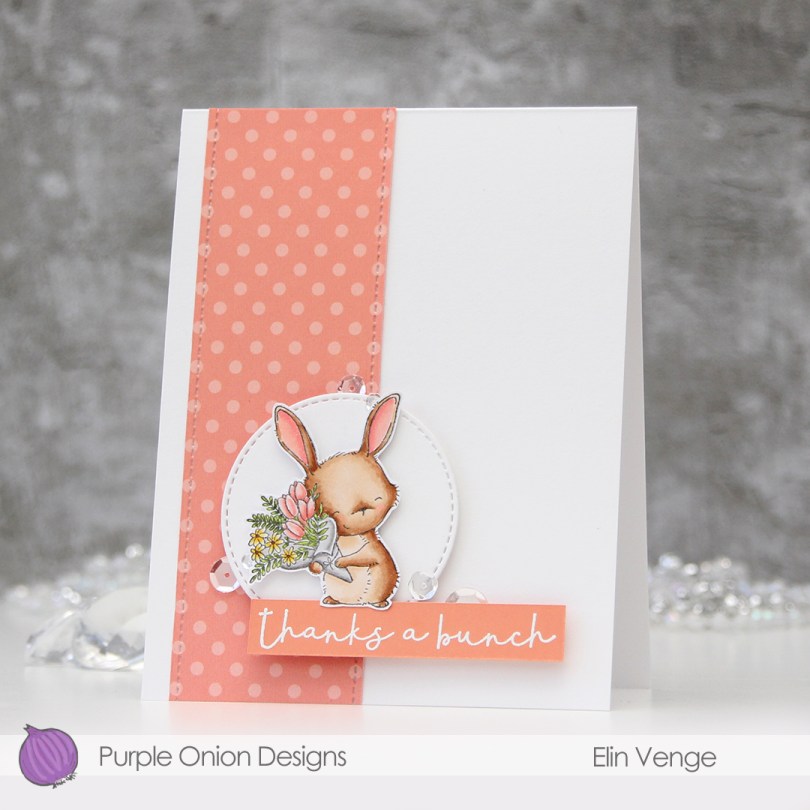 Once my coloring was done, I adhered it to a top fold A2 card base I created from white cardstock. Using the Snow Drifts Cover-Up die from My Favorite Things, I die cut three wavy pieces from solid colors Of cardstock to go towards the top of my card. I used Limeade Ice, Lovely Lady and Harvest Gold, all from Papertrey Ink. I butted them right up against each other, added them to a backer so I could handle one piece instead of three and mounted them on foam tape. I then die cut the Thanks from the Twice the Thanks die set from My Favorite Things four times from white cardstock from PTI. I love the cardstock from Papertrey Ink, it’s my favorite!! Onto a strip of Lovely Lady cardstock, I white heat embossed a sub sentiment from the Itty Bitty Basics stamp set from My Favorite Things and mounted it below my stacked Thanks die cut. To finish I added a few Sparkling Clear Sequins from Pretty Pink Posh.