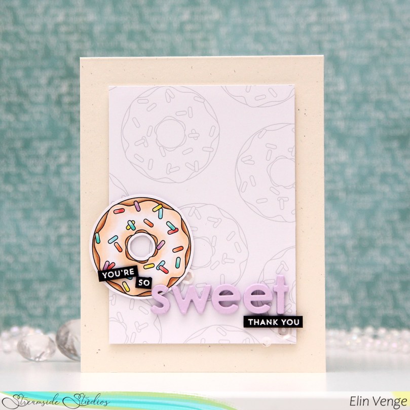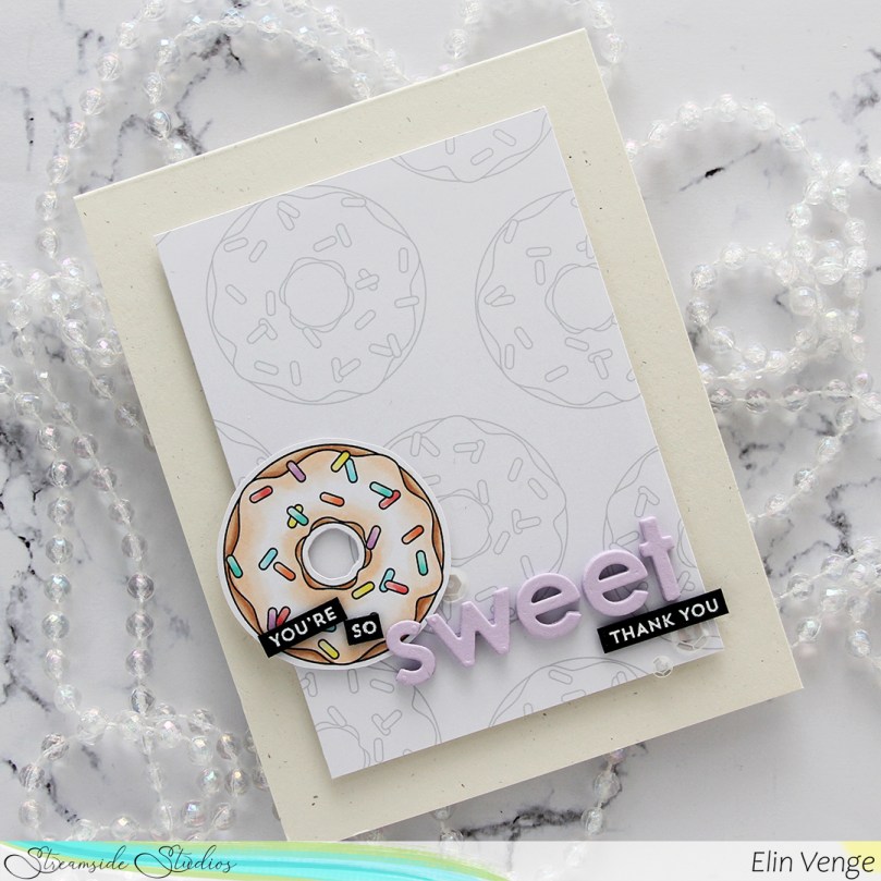 I colored the donut with my Copics and fussy cut it, leaving a thin white border around the edge. I printed a panel of several donuts in light gray for a bit of added interest in the background, popped up my panel onto a card base I created from Rustic Cream cardstock from Papertrey Ink, while I worked on the rest of the card.