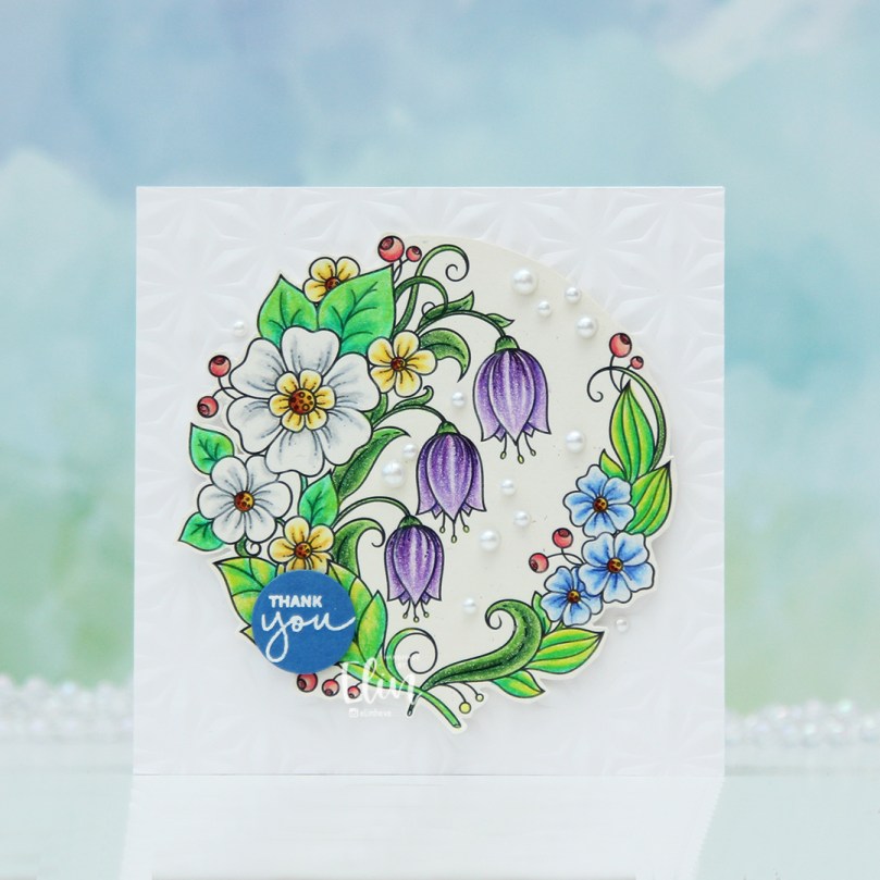 I stamped and white heat embossed a sentiment from the Mini Messages stamp set from Mama Elephant onto a piece of Cornflower cardstock from My Favorite Things, before using a nested circle die to turn it into a circle. I put a few foam squares behind it and adhered it to a part of the wreath where it wouldn’t cover up too many of the flowers.