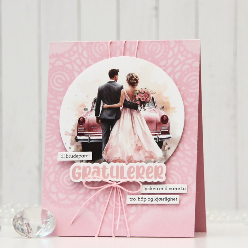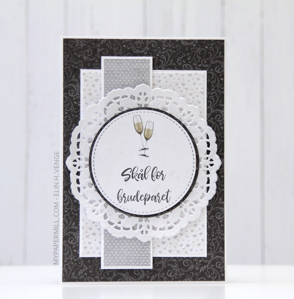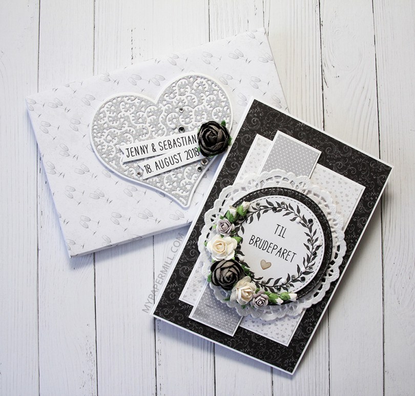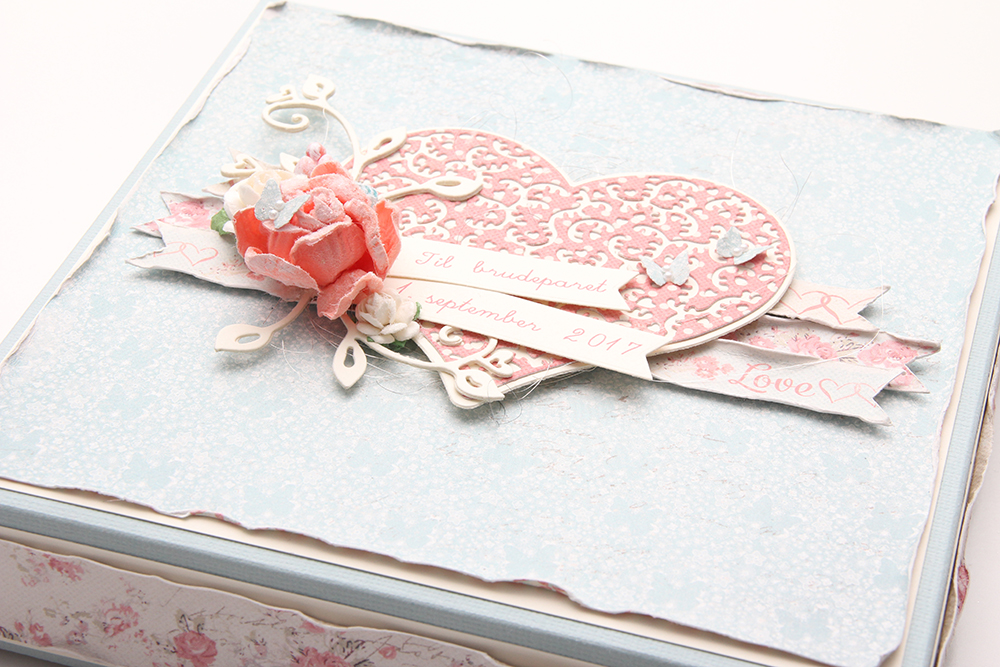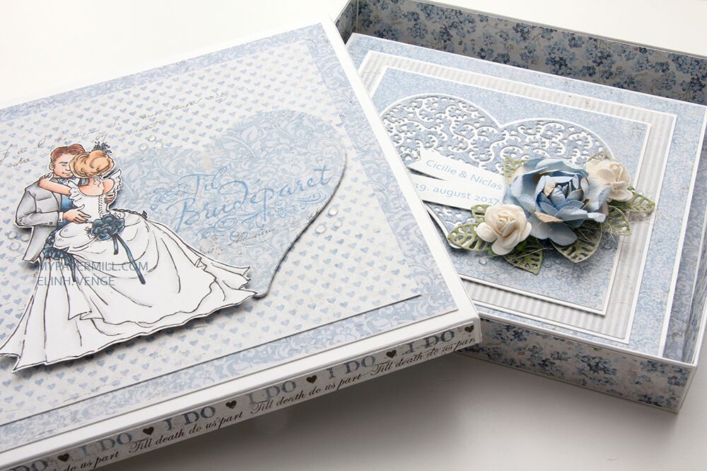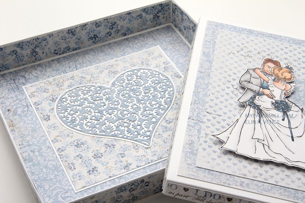 Jeg har brukt Bride and Groom til esken min, og som vanlig har jeg fargelagt med Copics. Jeg har ellers pyntet esken med papirer fra Vintage Wedding-serien til Maja Design, et diecut hjerte laget med en Papirdesign-die og et stempel fra Stempelglede, stemplet med Blueberry Sky blekk fra Papertrey Ink.