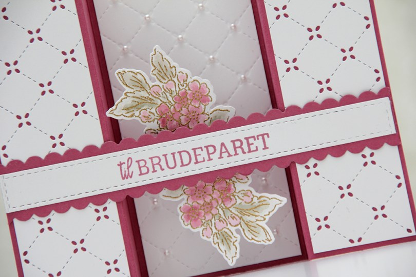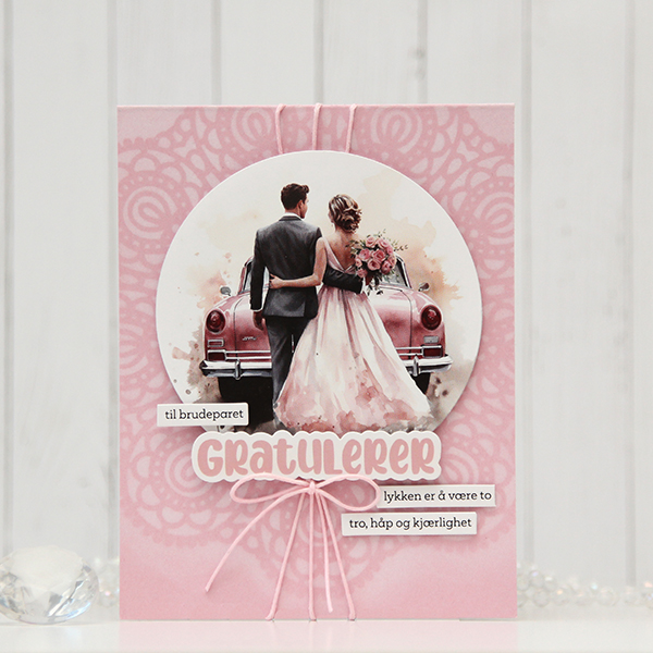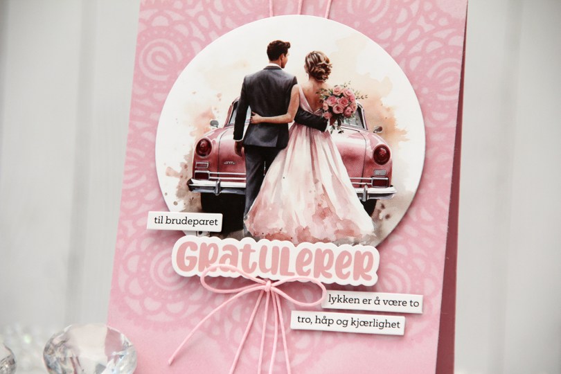 Jeg har montert hjertet med lave 3D-puter og limt på brudeparet med litt høyrere 3D-puter. Jeg har også brukt Nuvo-dråper til å lage de gjennomsiktige dottene på esken.