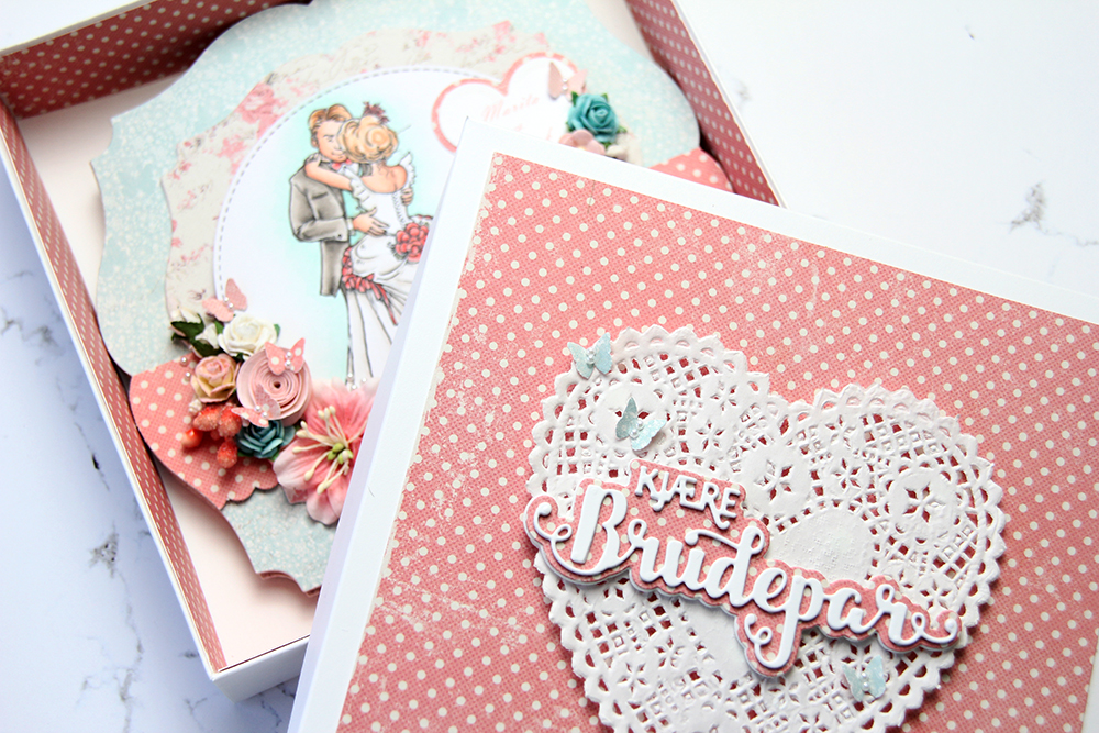 I used Bride and Groom for my box, as usual colored with Copics. I used patterned papers from the Vintage Wedding line by Maja Design, a heart I diecut using a Papirdesign die and a stamped sentiment from Stempelglede, stamped in Papertrey Ink Blueberry Sky ink.