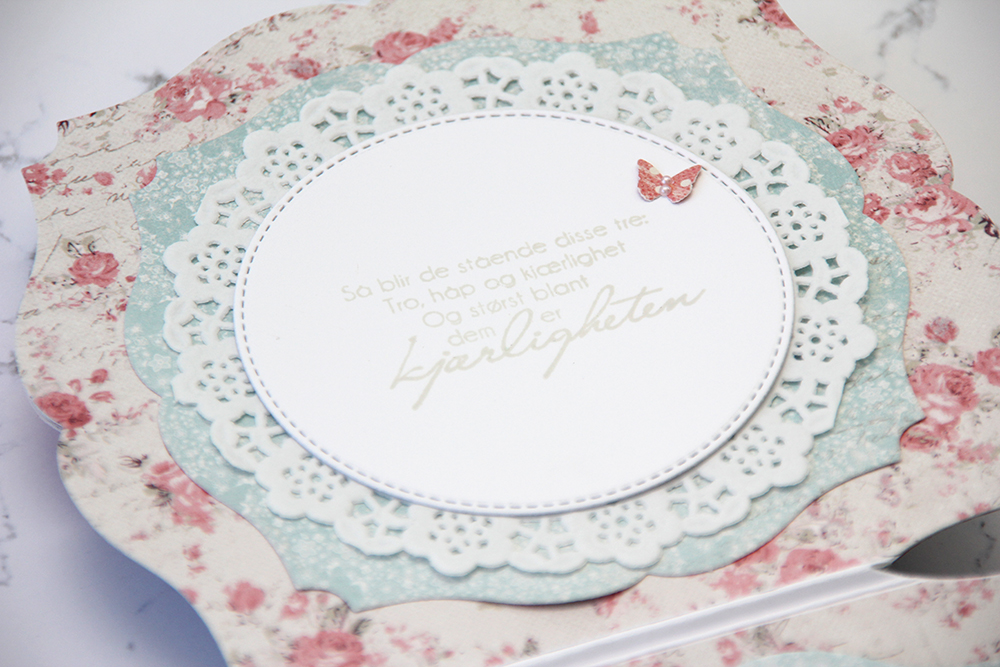 Og sånn ser det ut når kortet er tatt ut av esken. Jeg har brukt den samme dieen som på lokket av esken stanset ut i hvit kartong, og en annen die fra det samme settet (fra Papirdesign) stanset ut i mønsterark som jeg har limt oppå. Det blir litt mer liv i det med en gang, og henter samtidig opp tråden fra kortet, som har det samme hjertet på fronten.