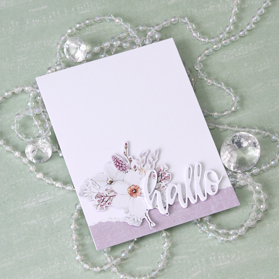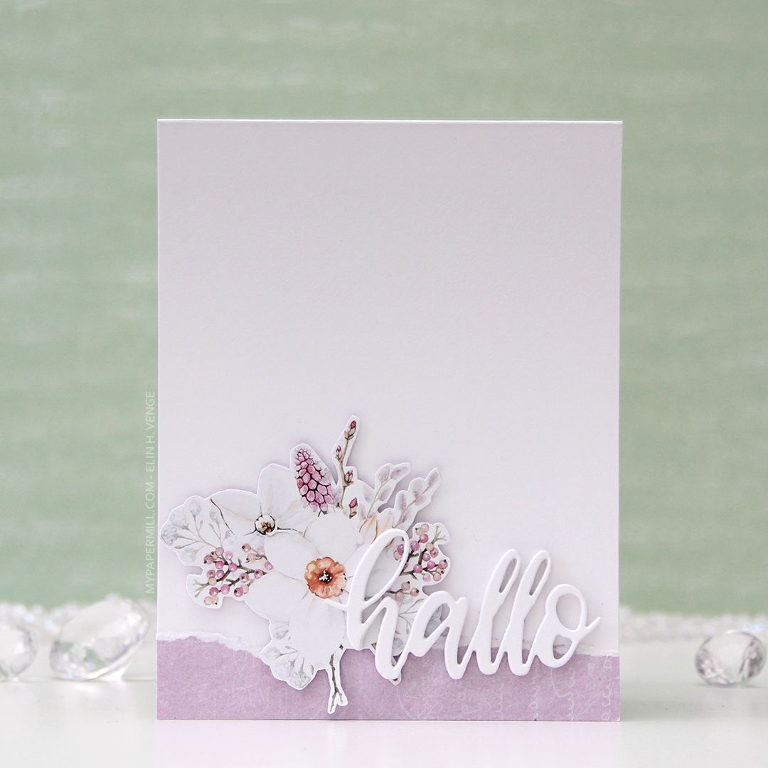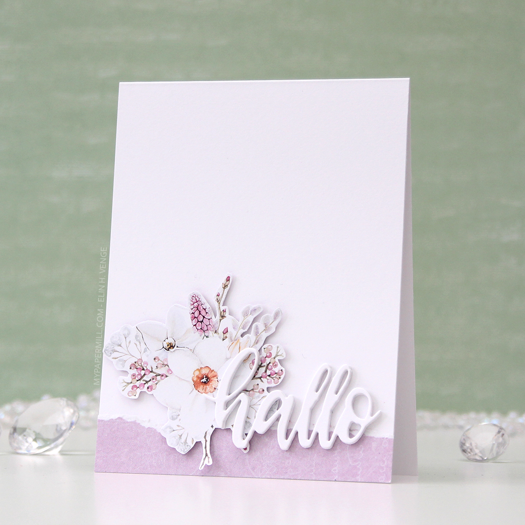 I used a die from Papirdesign to die cut from white cardstock the word hallo (hello) five times. I stacked them for a dimensional look and glued them onto my card. It covers part of that torn edge, part of the floral cluster and part of the cardbase, giving a nice cohesive feel to the card while still leaving plenty of white space.