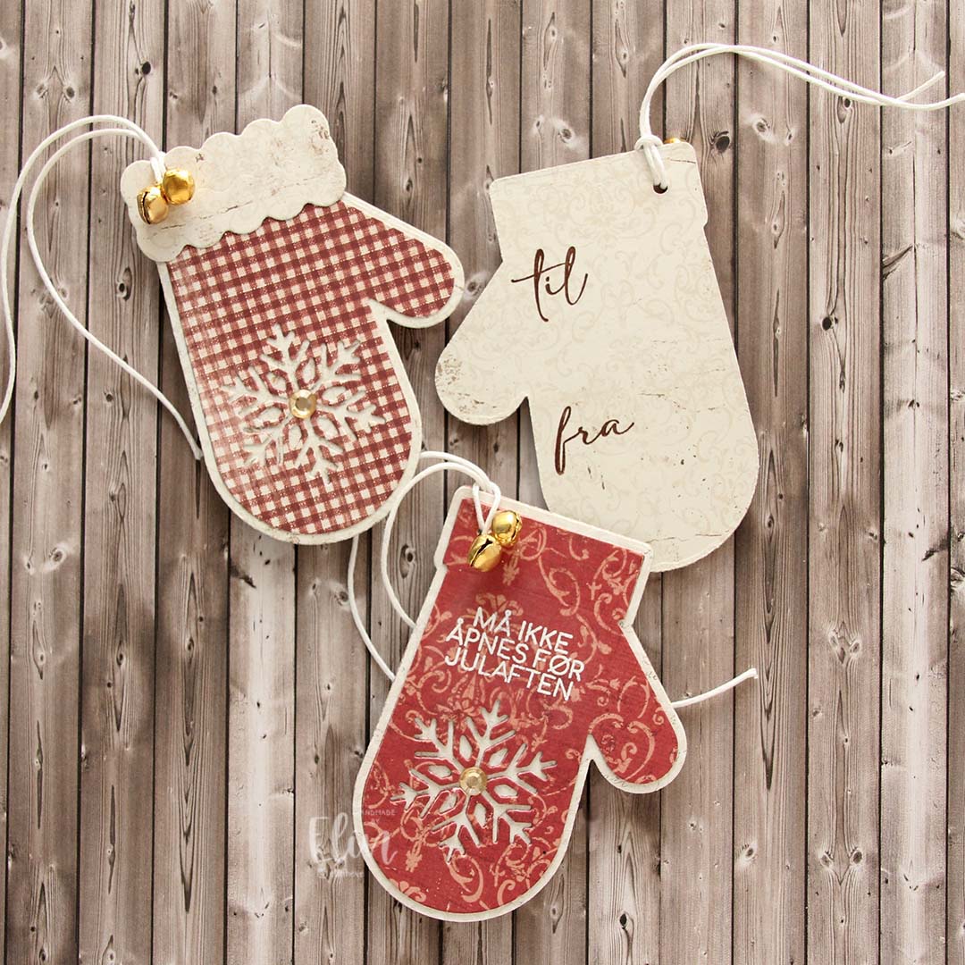 These mitten dies from Kort & Godt are perfect for gift tags. There are three dies in the set: the cuff, a base layer and a top layer. I only used the cuff on one of these, but used the base layer and top layer for all of them.