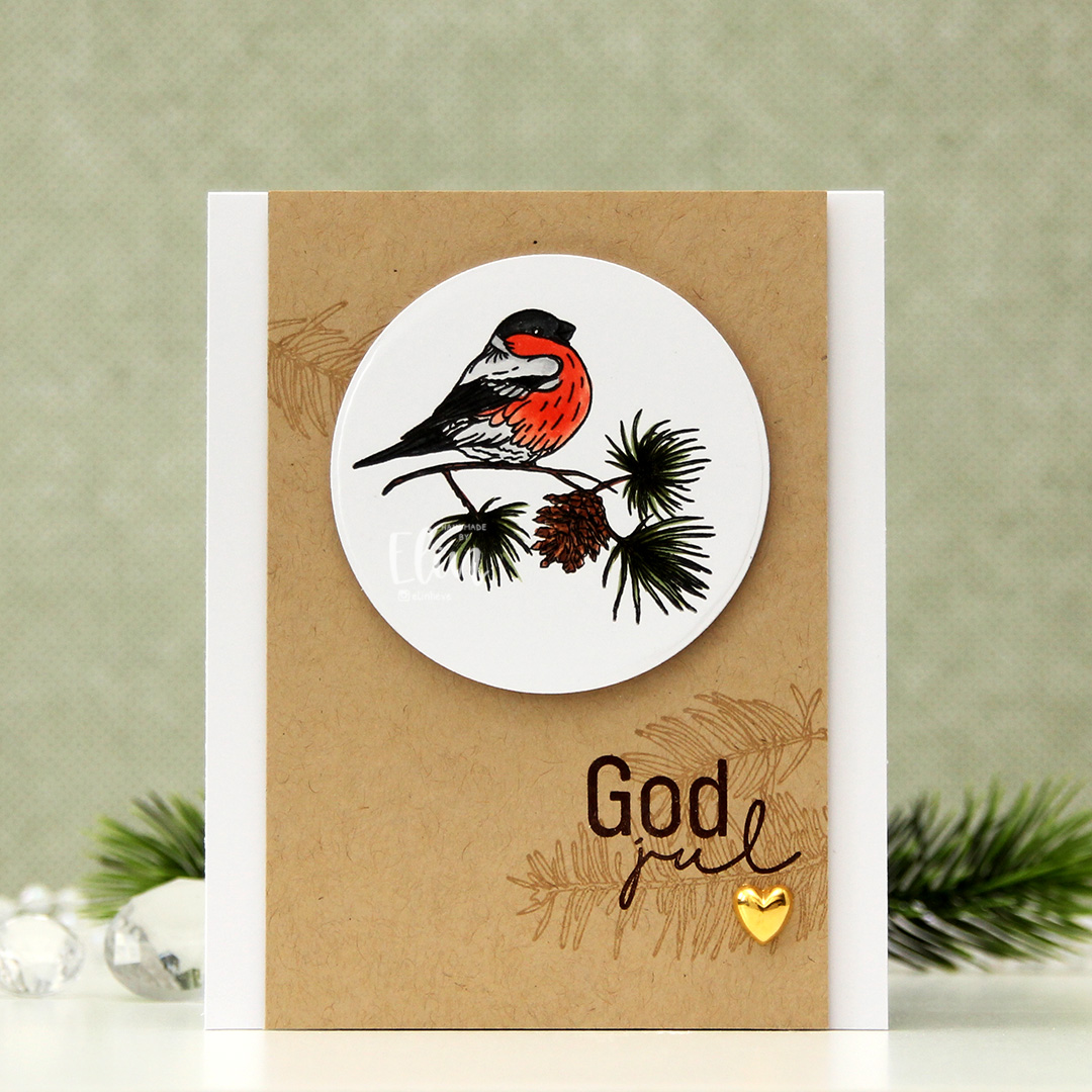 I used a die to create the word jul. The die actually cuts the word juleklem, but I only needed jul for my card and cut the other part off. Using an alphabet die, I die cut the letters to spell god and glued them above jul to complete my sentiment. I added the bullfinch image using foam squares and also added a big gold pearl to the knot on the bow for a little bit of shine to finish my card.