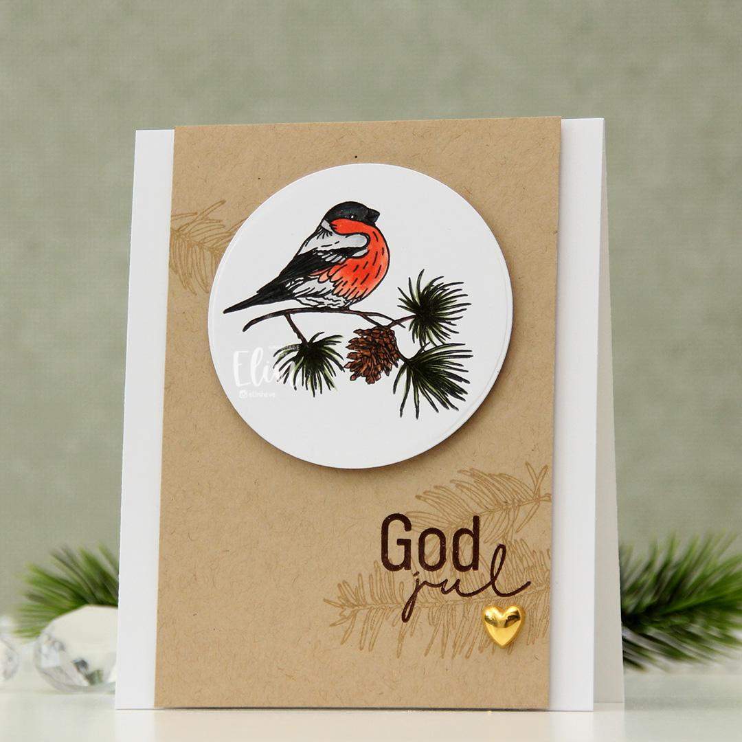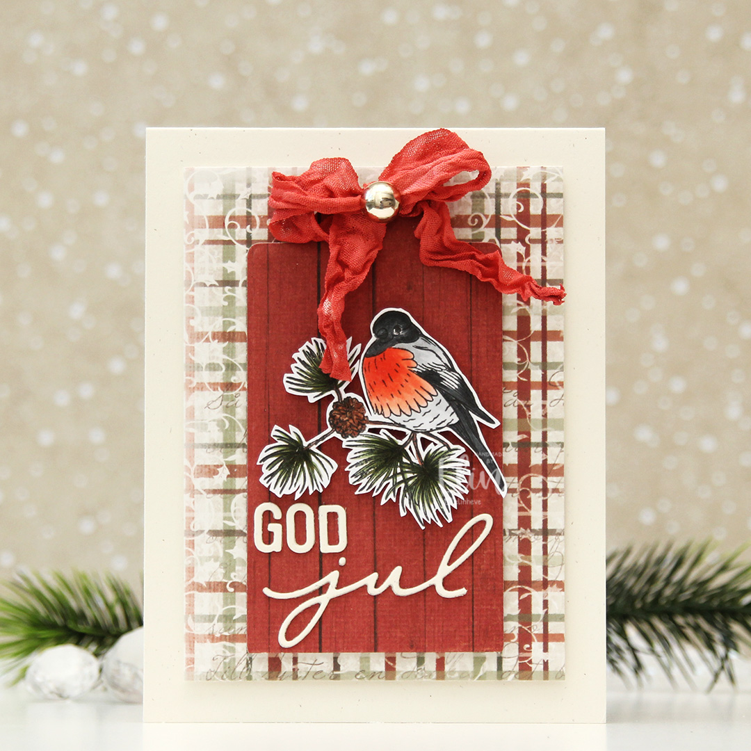 I shared a card a couple of weeks ago with a bullfinch. The stamp set has another bullfinch image, and I decided to put this one to good use too. This time I fussy cut around him, leaving a white trim around the edge. Onto a top fold card base I created from Rustic Cream cardstock from Papertrey Ink, I mounted a piece of patterned paper from Maja Design (Tomten kommer from the Gammaldags Jul collection). From the Christmas Flower sheet from the Wintertime in Swedish Lapland collection from Pion Design, I die cut a tag, added that in the center using foam tape and a bow at the top that I found in my stash.