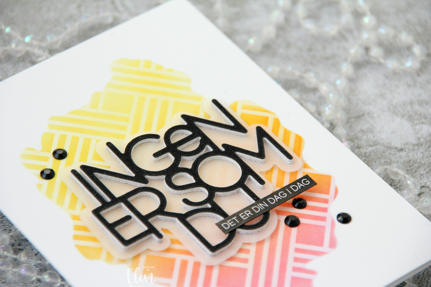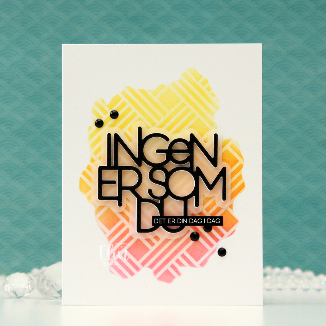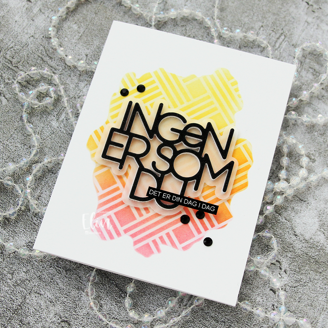 I die cut the Ingen er som du die six times from white cardstock, once from black glitter cardstock and the shadow die once from 40 lb vellum from Bazzill. I usually use a heavyweight vellum, but for this, I wanted some of the ink blending to show through, so a thinner version was the better choice for this particular card.