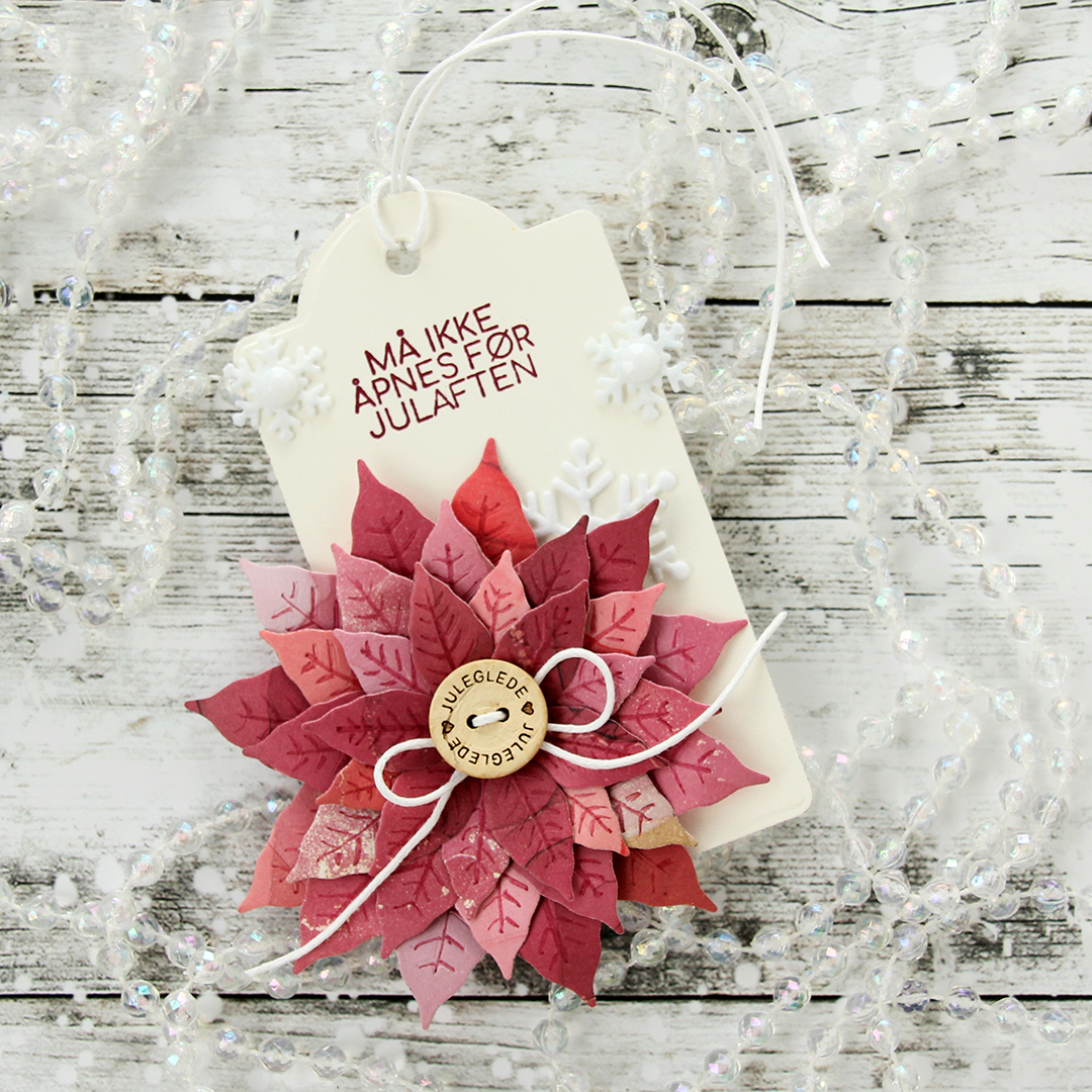 Die 302 Julestjerne creates an awesome poinsettia. I’m not usually one to use flowers on anything holiday related, but this die set has won me over. There’s three dies in the set – one creates a leaf (which I didn’t use on this tag), and then there are two dies that creates two sizes of petals for the actual flower. If you cut both twice you get a nice looking poinsettia. I cut both four times for this very full poinsettia. I used patterned paper from Craft Consortium, and there’s instant variety to the petals, I love it. The dies create indentations for the veiny lines, which I quickly enhanced with a Zig clean color real brush marker in a color that matched (230 Pale Rose).