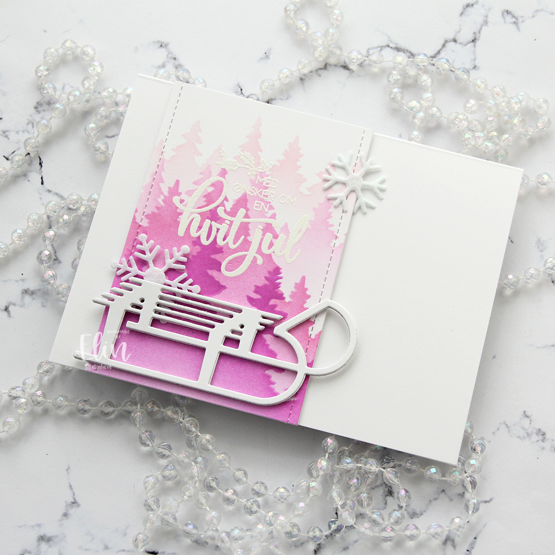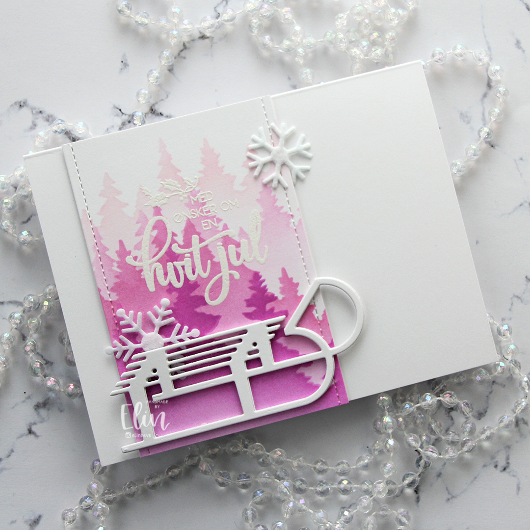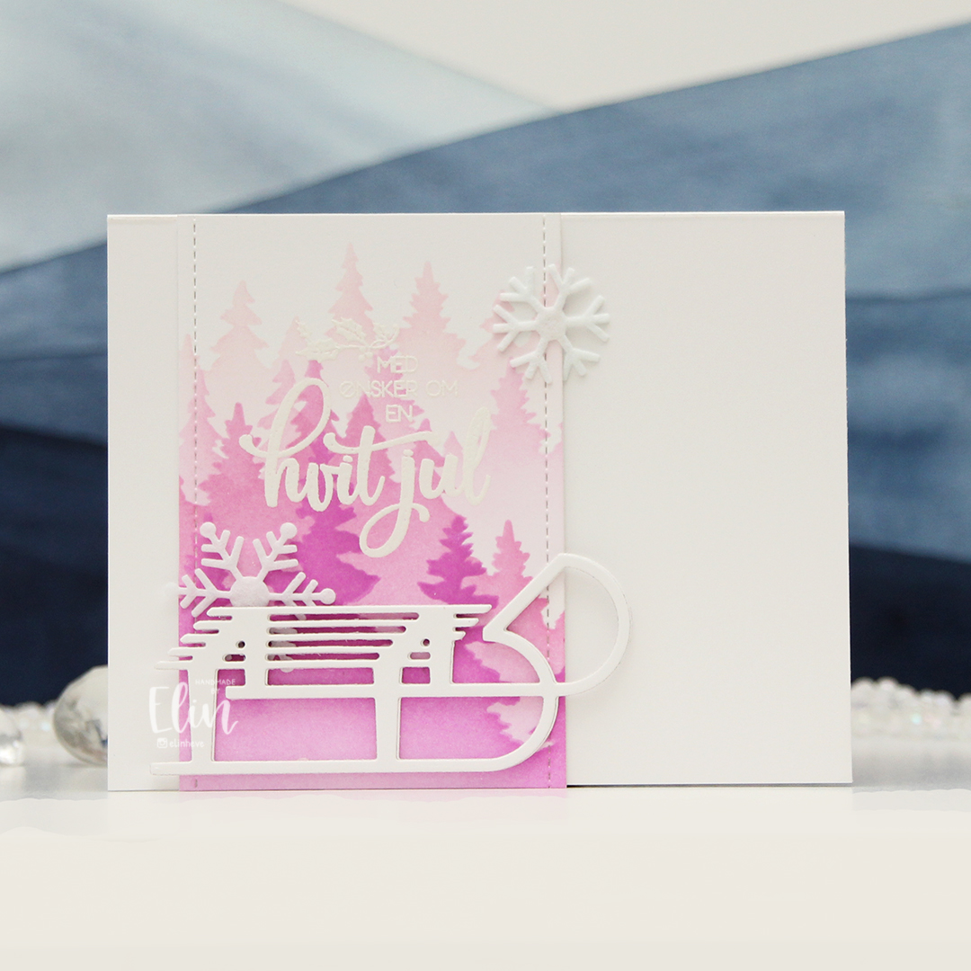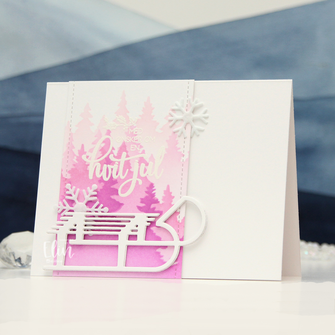 I started by ink blending trees in pink onto white cardstock. I used the Wintry Forest stencil set from Pinkfresh Studio along with Rose Quartz, Puffy Heart and Purple Wine inks from Altenew. I then stamped a sentiment in the M-428 stamp set from Kort & Godt and heat embossed in white. The heat embossing doesn’t really show up too well in my photos where the trees in the background are pale, but it’s more visible in real life. And if you want more contrast, you could start the blending with a darker color.