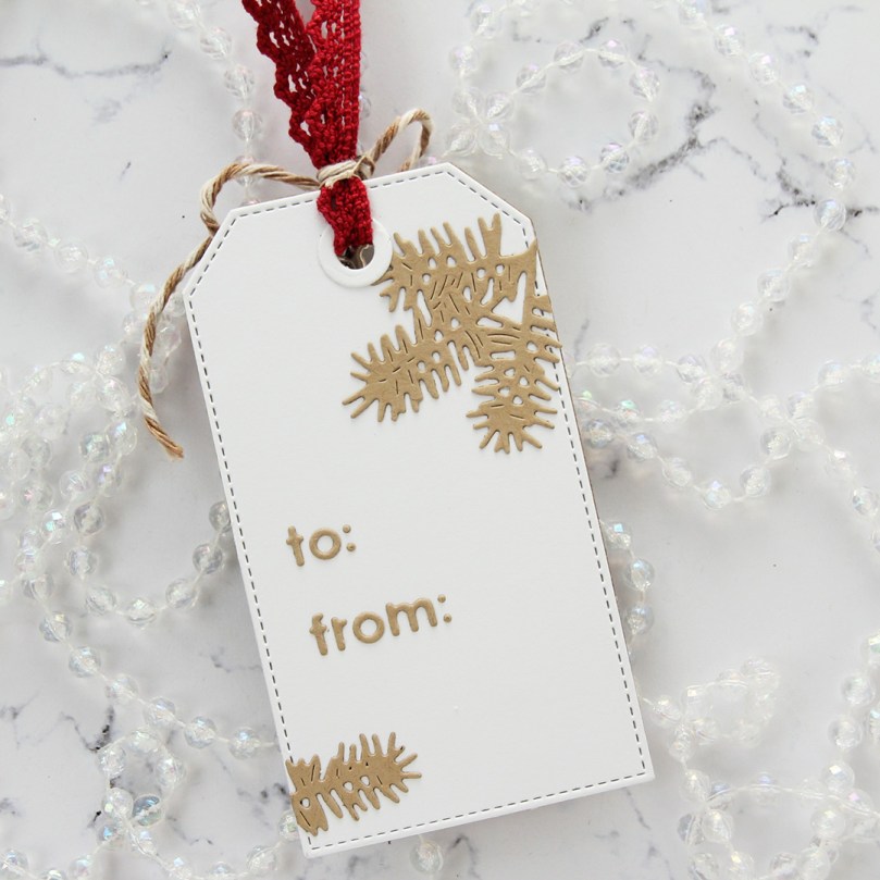 I die cut the same tag from white cardstock to use on the back. I added a couple of kraft colored branches that I die cut with the Pine Branches die set from Craft Emotions, as well as a to/from from the Tag Builder Blueprints 6 die set from My Favorite Things.