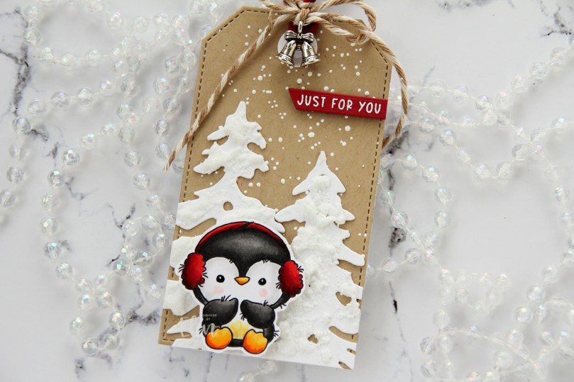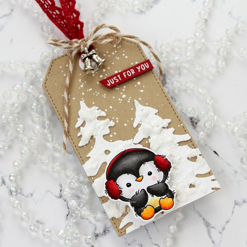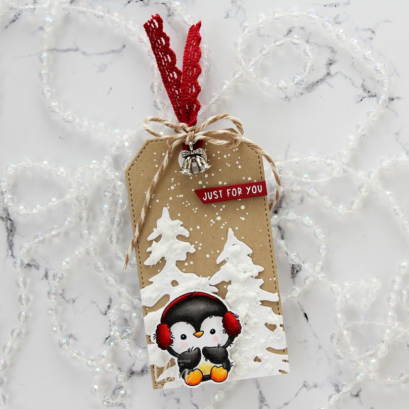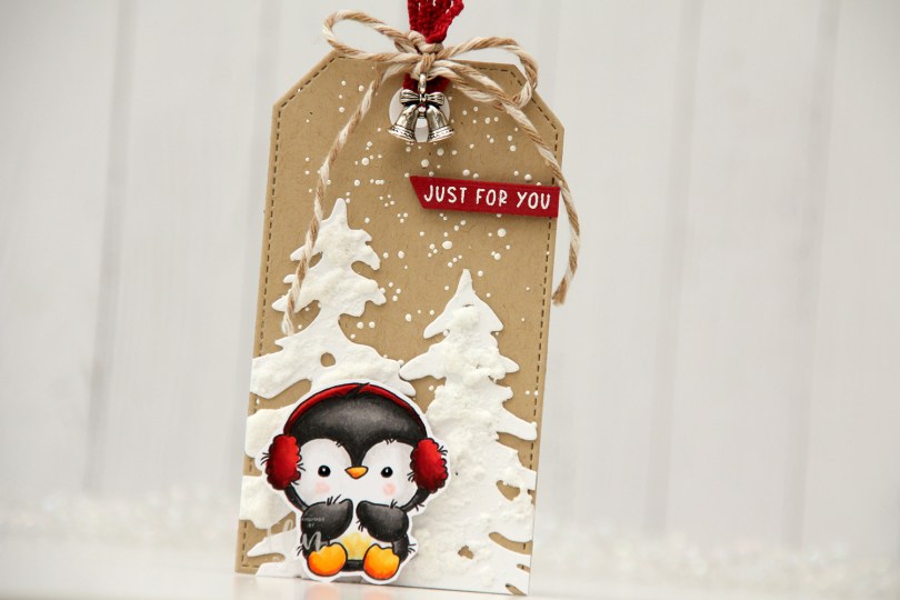 I used some ribbon and twine from my stash, as well as a charm, to finish off the front of this tag. The ribbon, banner and the penguin’s earmuffs create a visual triangle of red elements on this otherwise very neutral tag.