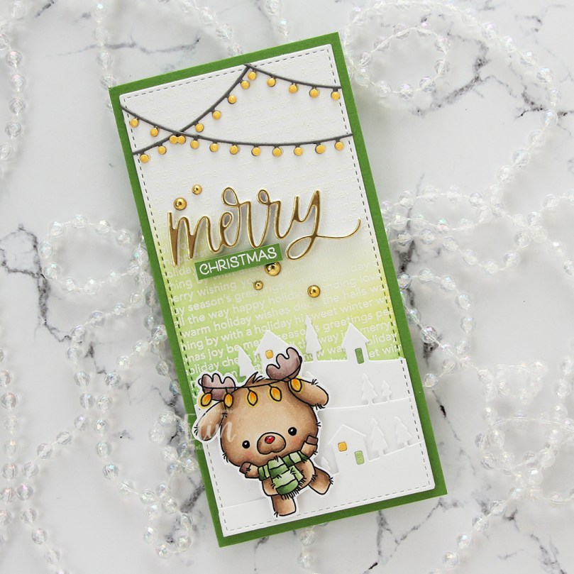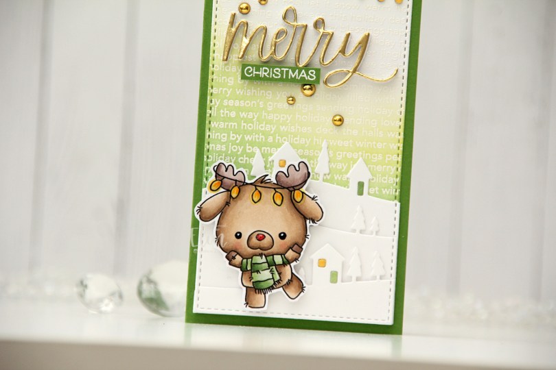 I die cut the word merry from the Merry Christmas die set from My Favorite Things five times from white cardstock, and once from Gold shine cardstock from My Favorite Things. I stacked them, adding the gold on top, and adhered my chunky die cut to the card. I stamped and white heat embossed a sentiment from the