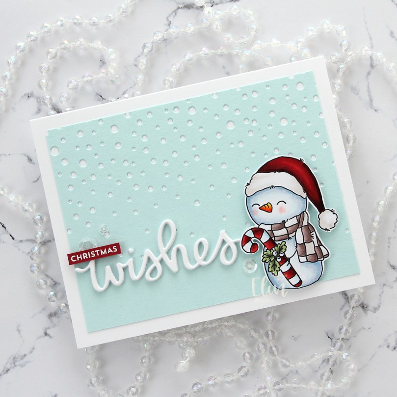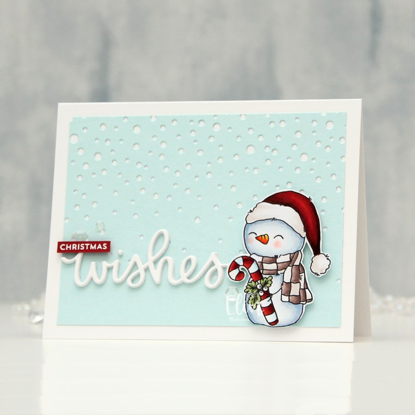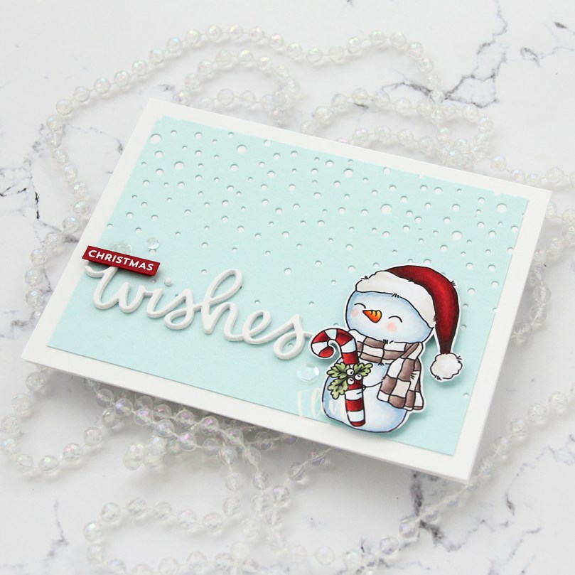 This card features a snowman from the Snowfolk stamp set. It’s no secret that I love snowmen, and I colored this guy with my Copics before fussy cutting him, leaving a white border around him to keep the little perpendicular lines that are instantly recognizable as a Lili of the Valley signature.