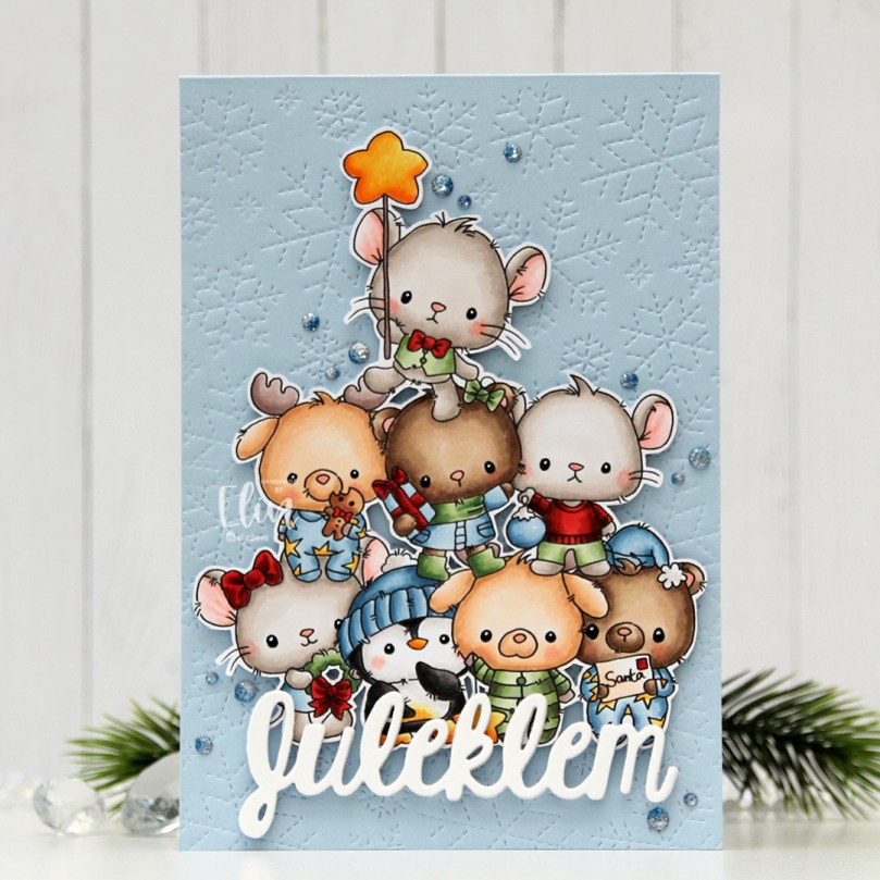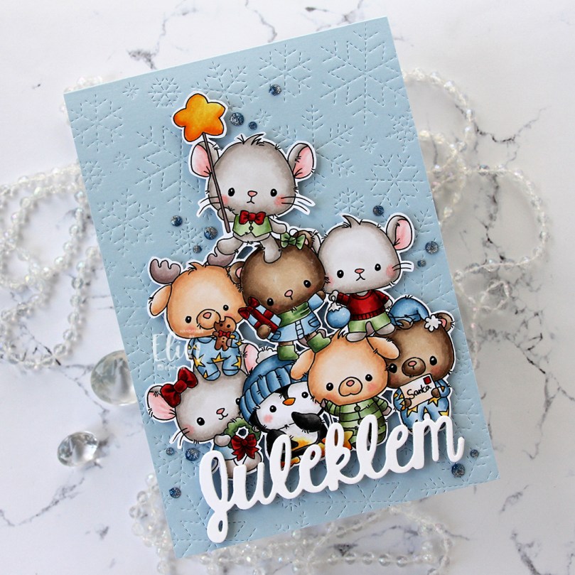 I used a die from Kort & Godt to create my sentiment (Christmas hug in Norwegian). I stacked four die cuts from white cardstock and adhered the top of the word to the bottom of my critter tree. I used Starry Sky ombré glitter drops from Pinkfresh Studio to finish off. I love the sparkle and shine to these.