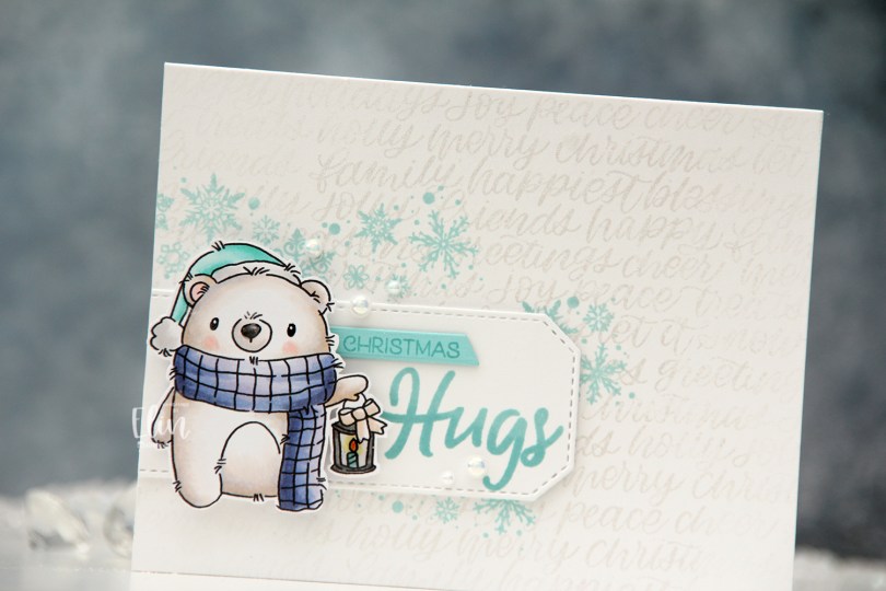 I die cut a white tag using a die from the Stitched Trad. Tag STAX die set from My Favorite Things and stamped the word Hugs from the Christmas Greetings stamp set from Lili of the Valley. My stamping is two-toned, I have Sno Cone ink from MFT at the top and Summer Splash ink, also from My Favorite Things, on the bottom part. Onto a piece of Summer Splash cardstock, I stamped Christmas, also from the Christmas Greetings stamp set from LOTV, using Summer Splash ink, before using a die from the Everyday Gift Box die set from My Favorite Things to turn it into a nice little banner. I added my polar bear with foam tape and finished off the card with a few pearls from the Glossy Porcelain Mix from Little Things from Lucy’s Cards.