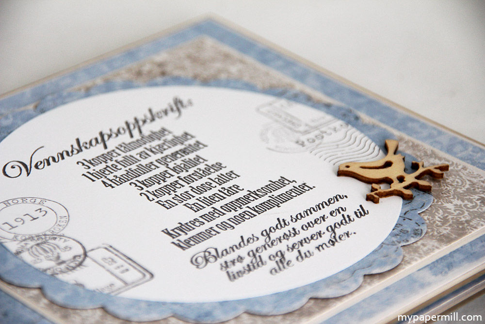 Jeg har generasjonsstemplet billett- og poststempler fra Marianne Design, Basic Grey og North Star Design med Memento Espresso Truffle. Jeg har satt på en kremhvit blonde fra Kort & Godt og en rosebord fra Wycinanka. Perlene kommer fra Kaisercraft, og scallopsirkelen er stanset ut med en die fra Lifestyle Crafts, det samme er panelet med godvennene! Hashtagstemplene kommer fra Hashtags, kreativ lek-platen til North Star Design. Jeg har tegnet en tynn ramme rundt dem og skjært dem ut.