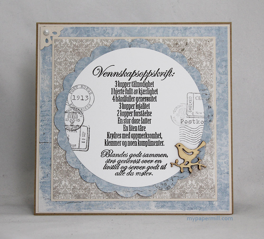 I stamped an old sentiment stamp from Norsk Stempelblad on the back, in Hero Arts Wet Cement ink, of course.