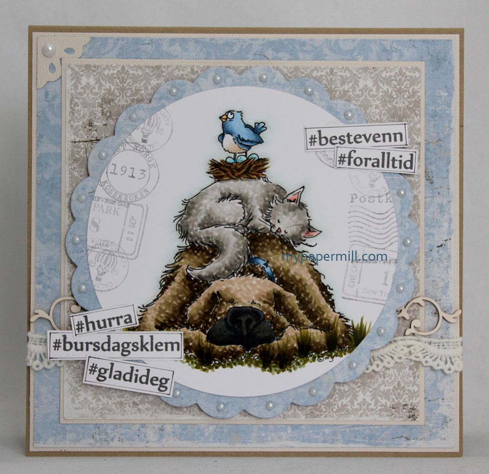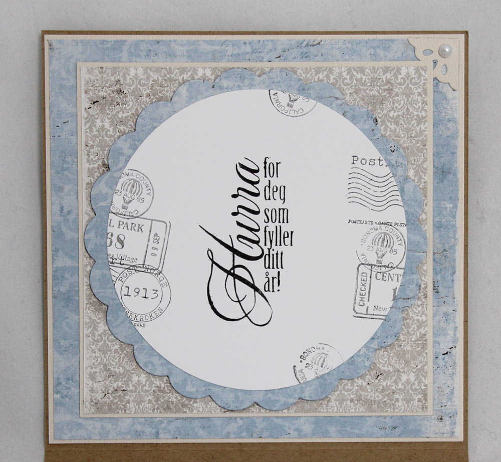 I did some generation stamping with ticket and postmark stamps from Marianne Design, Basic Grey and North Star Design using Memento Espresso Truffle. I added a creme colored lace from Kort & Godt and a rose border from Wycinanka. The pearls are from Kaisercraft, and I diecut the scalloped circle with a Lifestyle Crafts die, did the same thing with the actual image and a circle die. The hashtag stamps are from the Hashtags, kreativ lek stamp set from North Star Design. I drew a thin frame around each of the hashtags and cut them out.