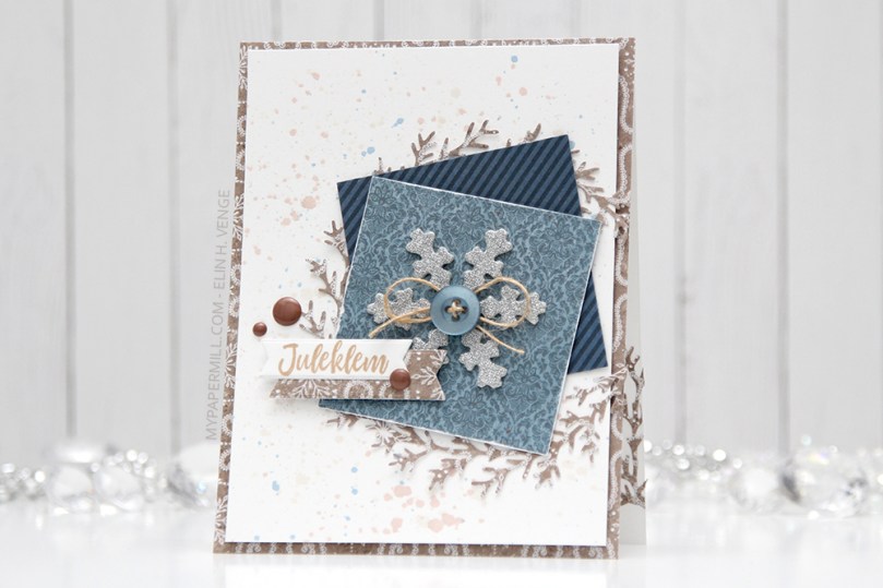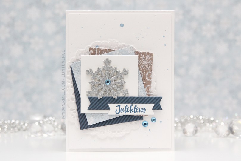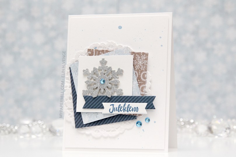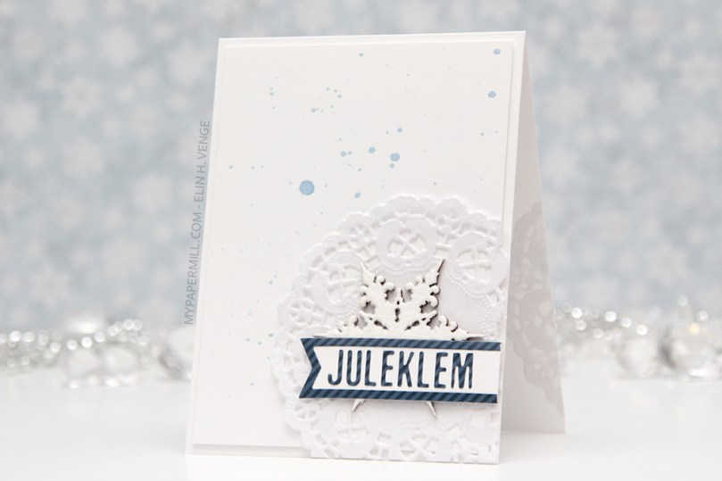 Kort nummer tre er helt uten stempling. Her er kakeservietten tilbake, kun splatter i én farge og jeg har stanset ordet juleklem ut av et mønsterark og limt på et finérsnøfnugg som er embosset i hvitt og dekket med glitter. Som på de forrige kortene er også teksten på dette kortet på et banner.