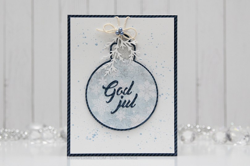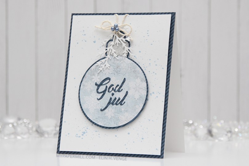 Det siste kortet har fått tilbake mønsterark like stort som basen, akkurat som kort nummer to. Det lager en veldig fin ramme til enkle kort og gjør litt mer ut av kortet. Heller ikke her er det stemplet noe, jeg har stanset ut ordene god jul og limt dem på julekulen min.