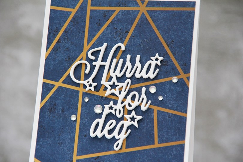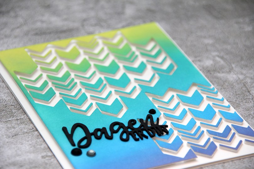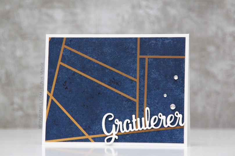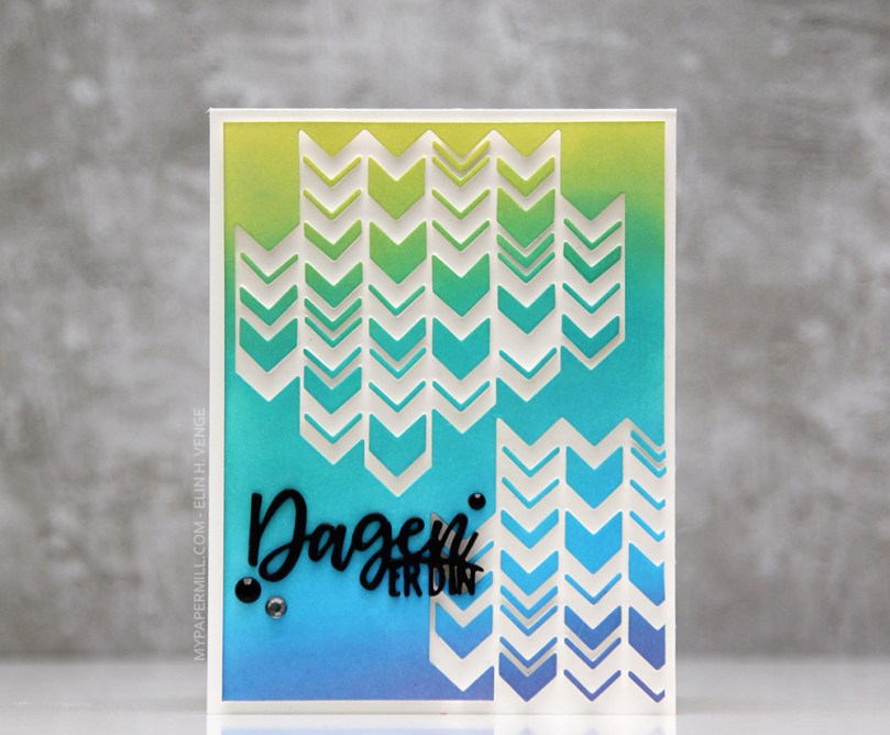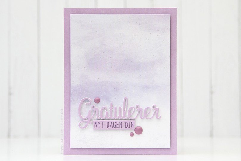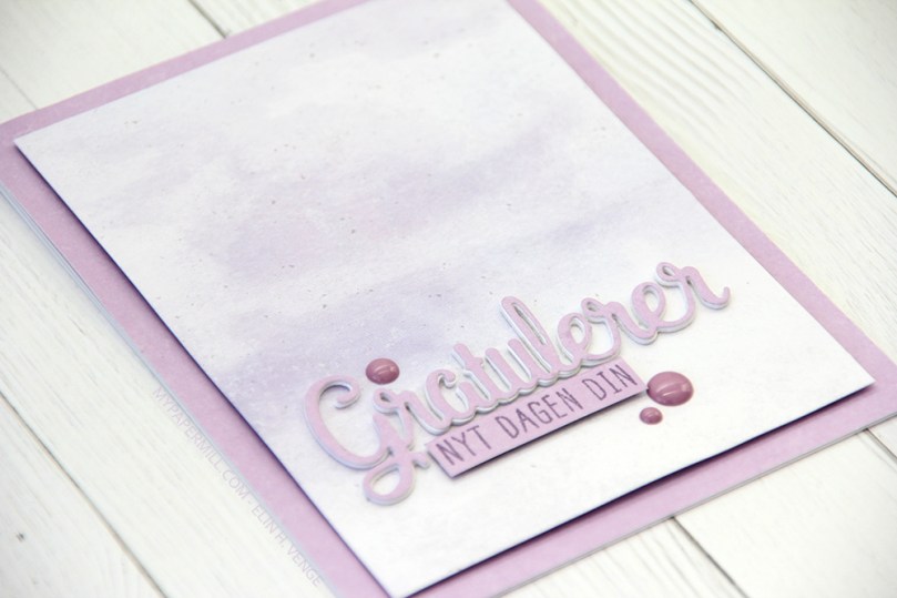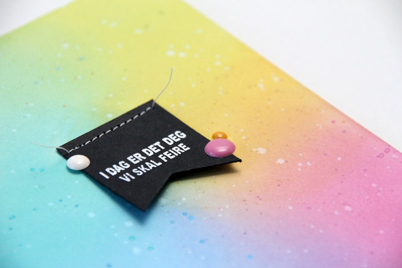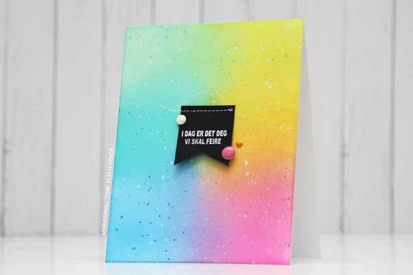 På kort nummer to skjærte jeg til et mønsterark så det ble nøyaktig like stort som kortbasen min, og her valgte jeg en tilleggsfarge til splattingen min siden jeg hadde såpass mye kraftfarget på kortet. Endret litt på designet fra det forrige kortet – jeg speilvendte mer eller mindre hele kortet.