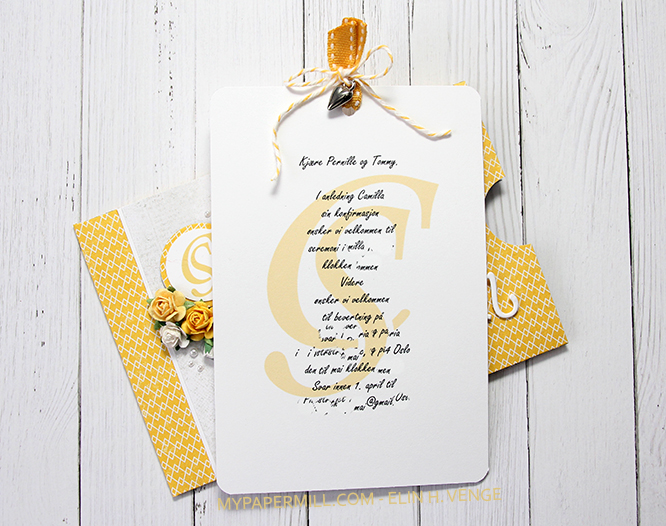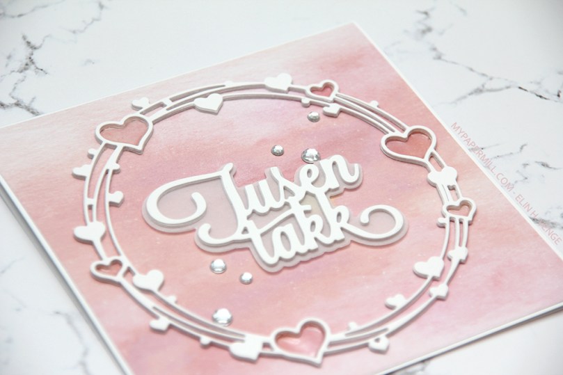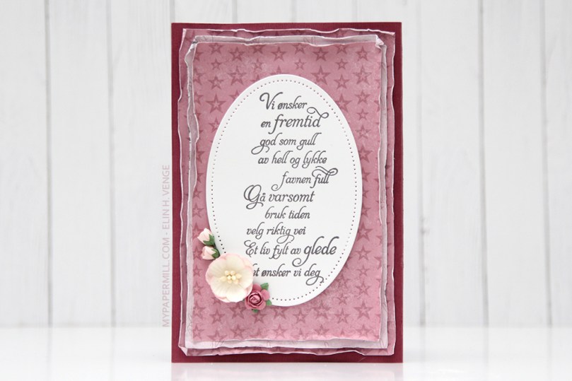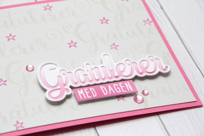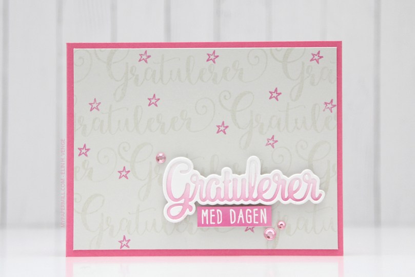 Utenom produktene fra Papirdesign har jeg brukt blekk og knapper fra Papertrey Ink, bannerdies fra My Favorite Things, embossingpulver og glitter fra Ranger, og twine og hemp fra henholdsvis May Arts og Hemptique.