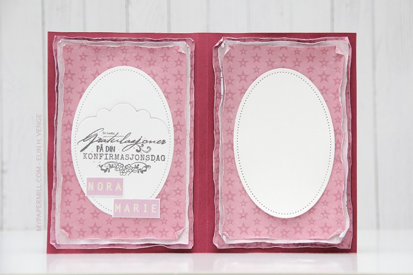 Her ble ikke hele kakeservietten brukt på forsiden, så deler av den ble limt inni kortet, akkurat som kransen på det forrige. Det er en veldig grei måte å bruke opp rester på, samtidig som det gir en helhet til kortet og pynter innsiden litt i samme slengen.