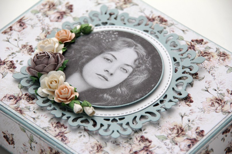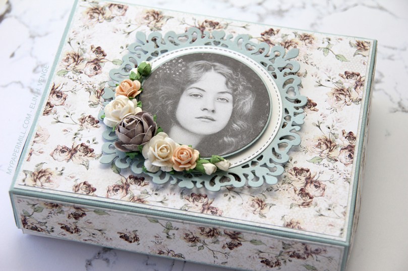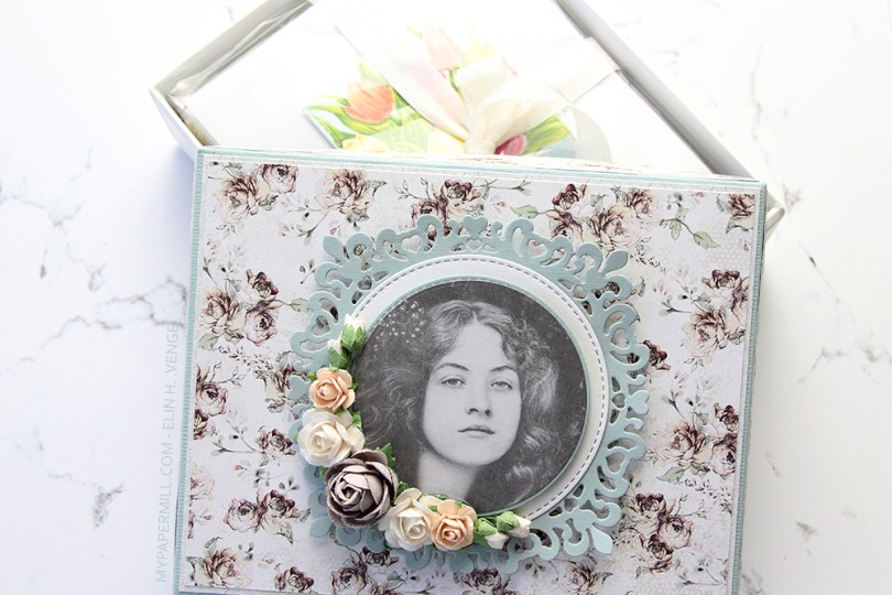 Jeg har pyntet esken vedig enkelt med en grå peon, hvite roser og et par ferskenfargede roser som passet den turkise kartongen jeg brukte.