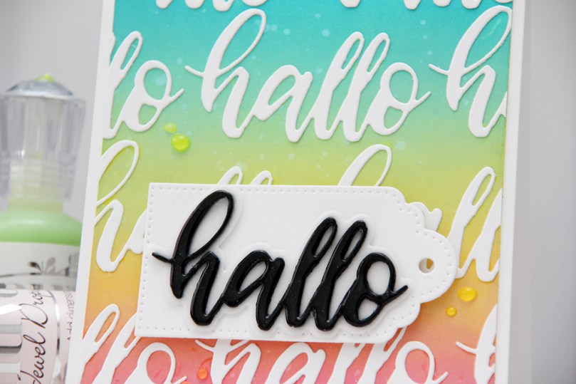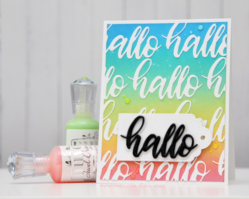 Jeg svertet Distress Oxide (Picked Raspberry, Fossilized Amber, Twisted Citron, Cracked Pistachio, Peacock Feathers og Salty Ocean) på et panel Stamper’s Select White kartong og sprutet litt vann over. Jeg stanset ut den superkule hallo-dieen til Papirdesign flere ganger i den samme hvite kartongen og limte dem på det svertede panelet før jeg limte det til kortbasen min.
