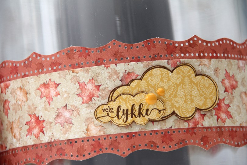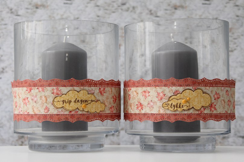Jeg har laget magebelter til to veldig enkle glasslykter jeg har til lys. Jeg brenner mye lys om høsten, så jeg tenkte dette kunne passe fint. De nye høstarkene fra Tur i skogen-kolleksjonen var perfekte for formålet, og jeg har brukt to av arkene fra serien (både for- og bakside av det ene arket).