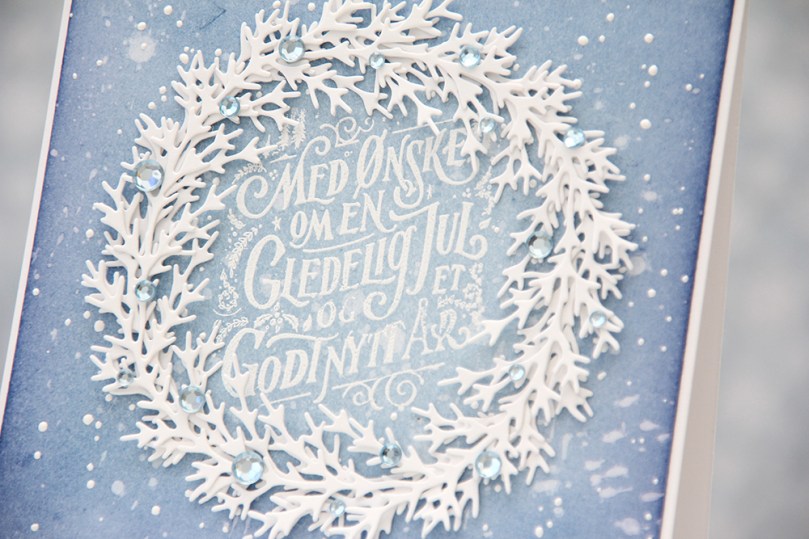 Jeg stemplet en tekst fra en av de nye stempelplatene og embosset i hvitt før jeg svertet med forskjellige farger blått blekk på hele panelet. Hvitt og blått er favorittkombinasjonen min til juekort, så jeg pyntet veldig enkelt med noen lyseblå krystaller og sa meg ferdig med hele kortet.