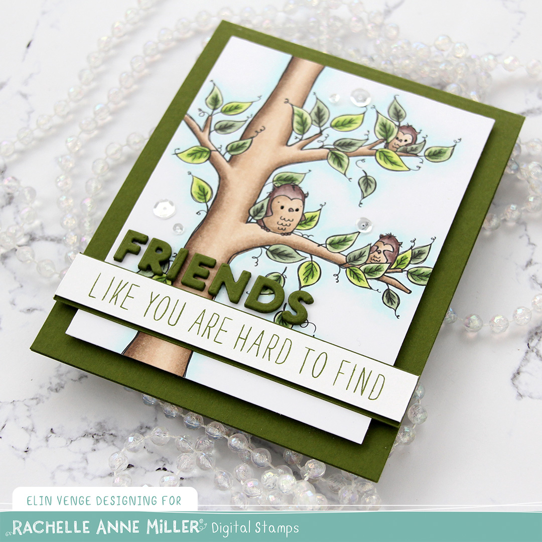 From the same color cardstock, I used the Connected alphabet die set from My Favorite Things to die cut the letters to spell the word FRIENDS. I die cut each of the letters three times and stacked them for a dimensional look. Using Jalapeño Popper ink from My Favorite Things, I stamped the rest of the sentiment using the Bella Letters stamp set from Mama Elephant onto a strip of white cardstock from Papertrey Ink. I took my time stamping, I wanted this to look pretty straight, and if you’ve ever stamped a sentiment with individual letter stamps, you know that you just can’t rush it.